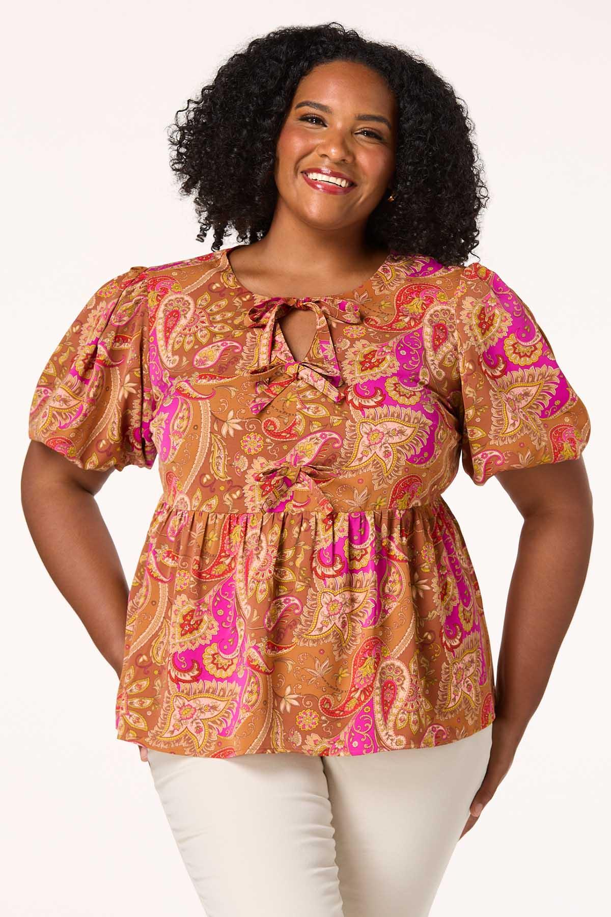 This style is oh-so stunning and perfect for helping you stand out in the best way. Lightweight-smooth fabric features an eye-catching multicolor floral-paisley print, a multi-tie front closure, puffy bubble short sleeves and a peplum hem for a flirty and fun style.