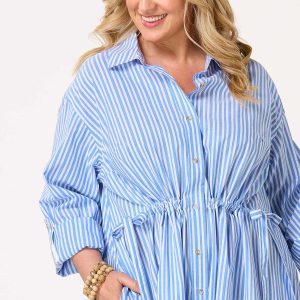 Set sail in style with this striped shirt dress. Featuring flattering ties at the waist, this dress cinches your silhouette for a feminine, tailored fit. Whether you’re strolling along the coast or enjoying a weekend getaway, this versatile piece combines comfort and elegance. Pair with sandals for laid-back vibes or dress it up with wedges for a more elevated look to navigate your day.