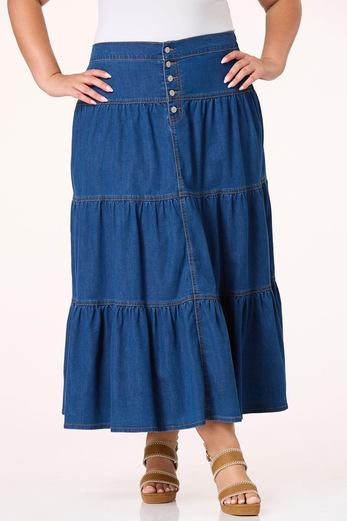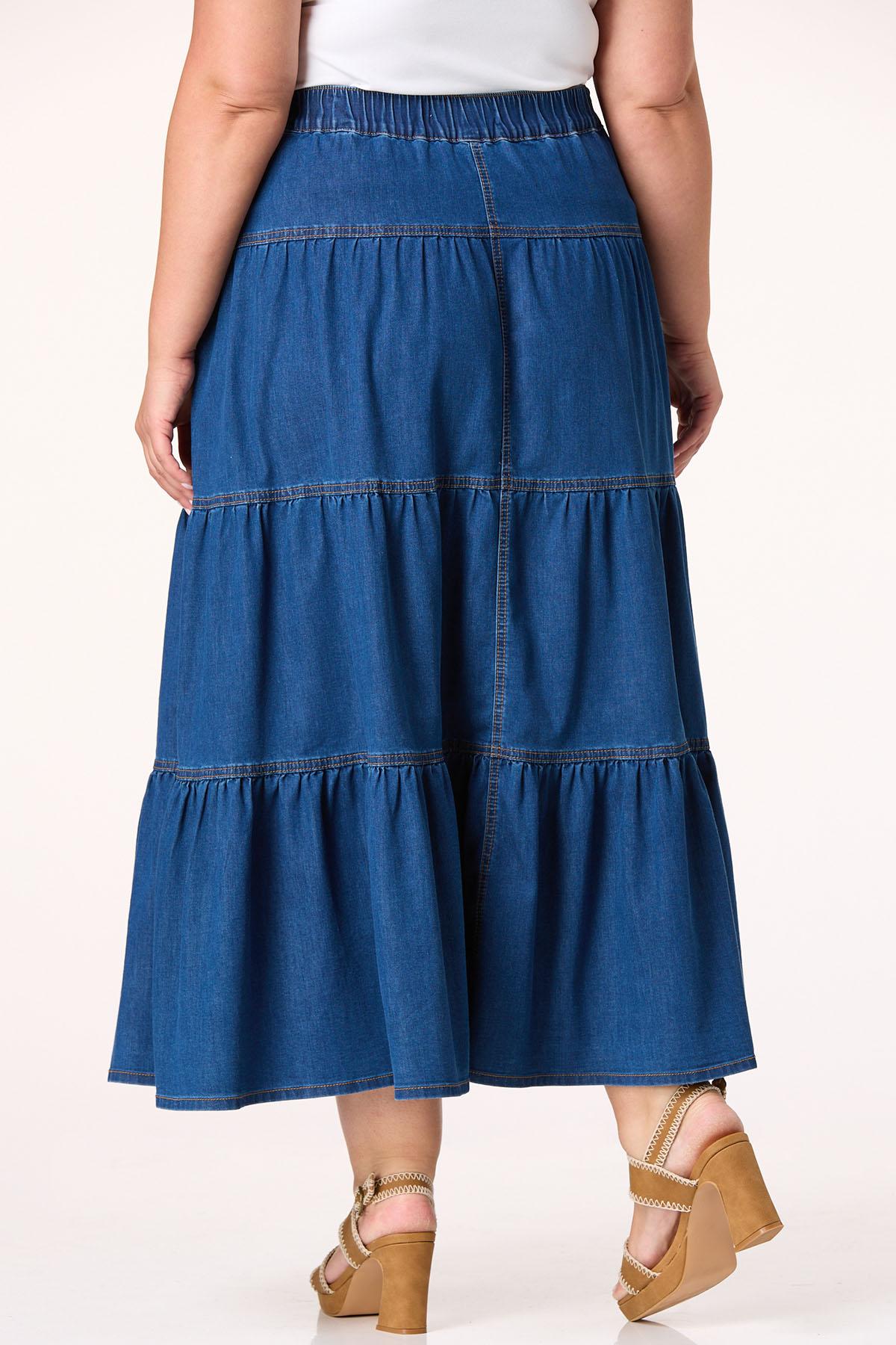 This casual and cool skirt is such a pretty look. Lightweight denim features a dark-wash hue with a button fly closure, a tiered body and a flowy midi-length hem. Such a cool way to hop on the denim trend.