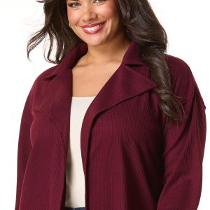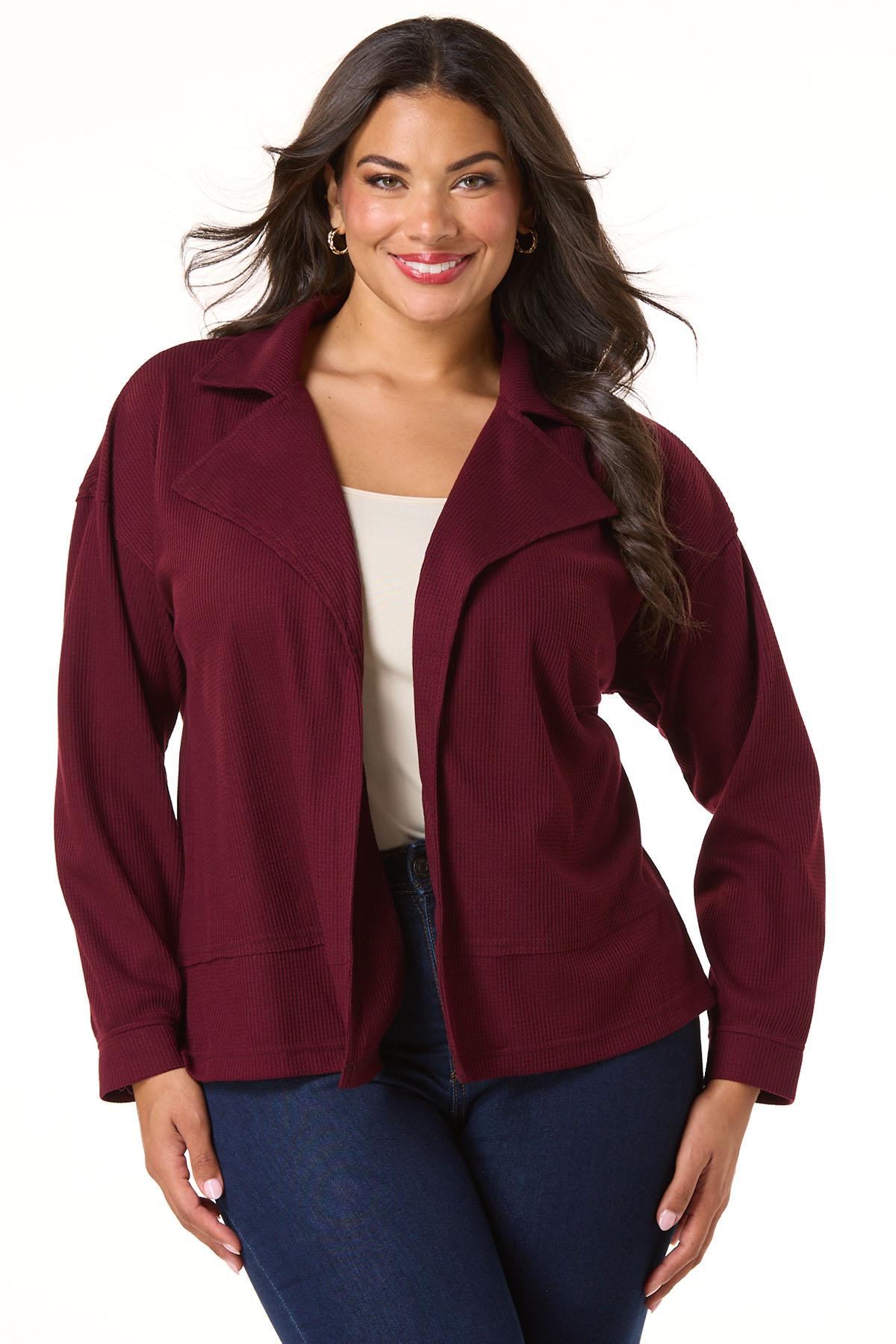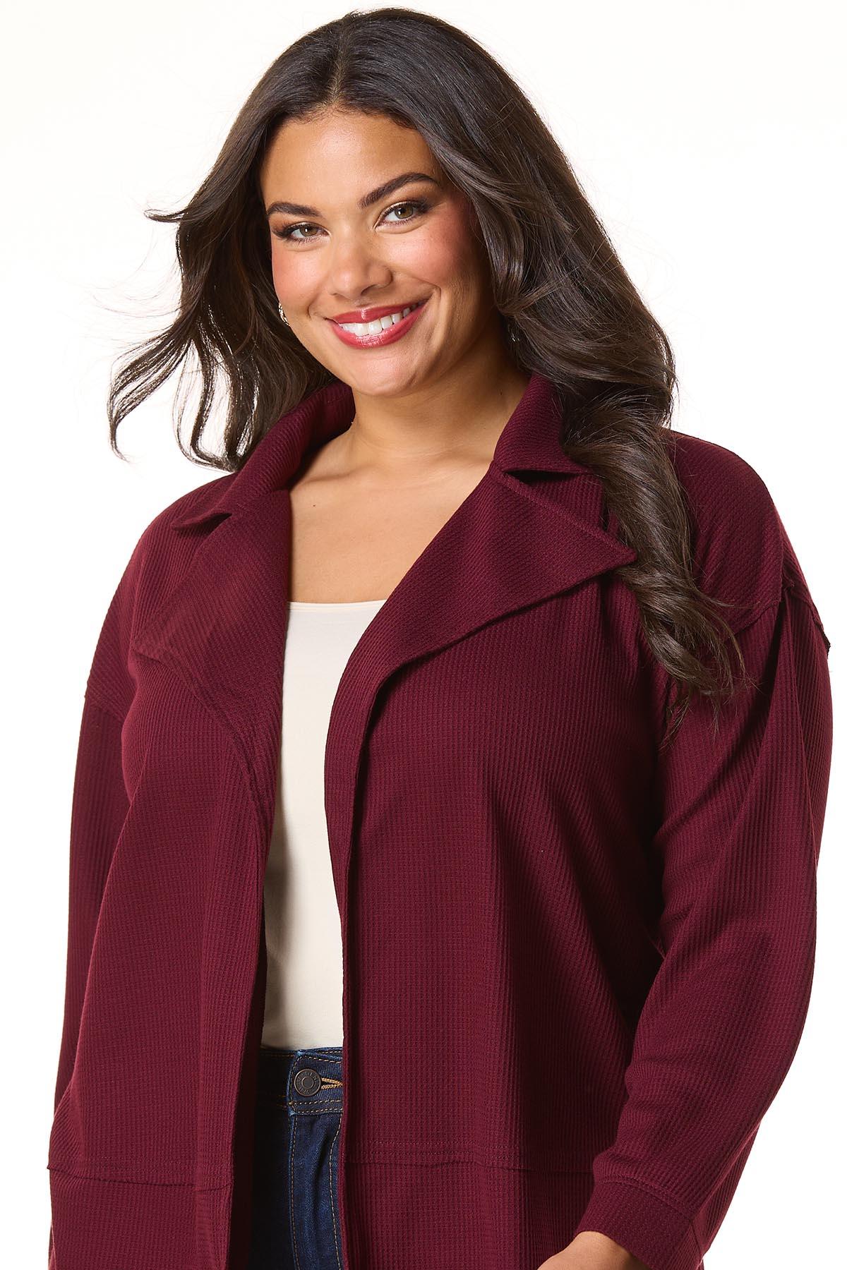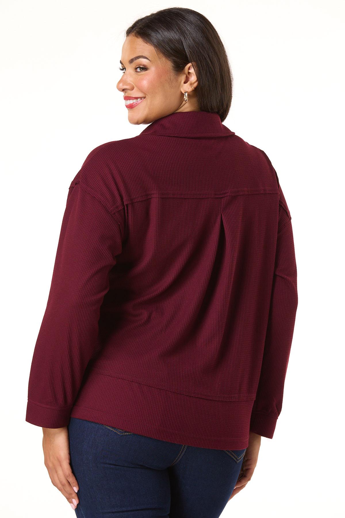 It’s the layering piece you’ll love to love time and time again. Warm up your favorite basics with the soft-waffled knit, cranberry-red hue and relaxed fit of this cute-collared look.