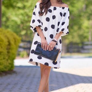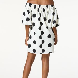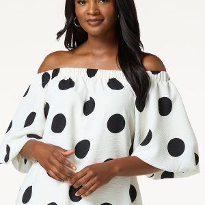 Looking darling in dots is easy-to-do with this precious piece, featuring a convertible on/off shoulder design, billowy-bubble sleeves, shades of black and white, a flowy fit and a bold, polka dot print topping a wrinkle-free fabric.