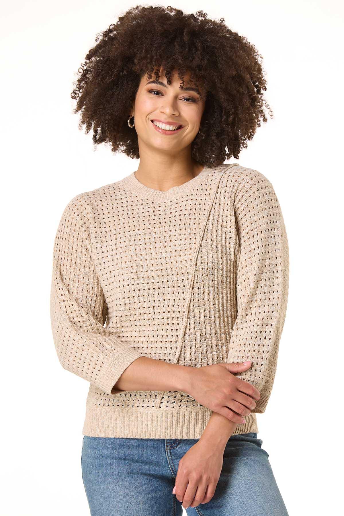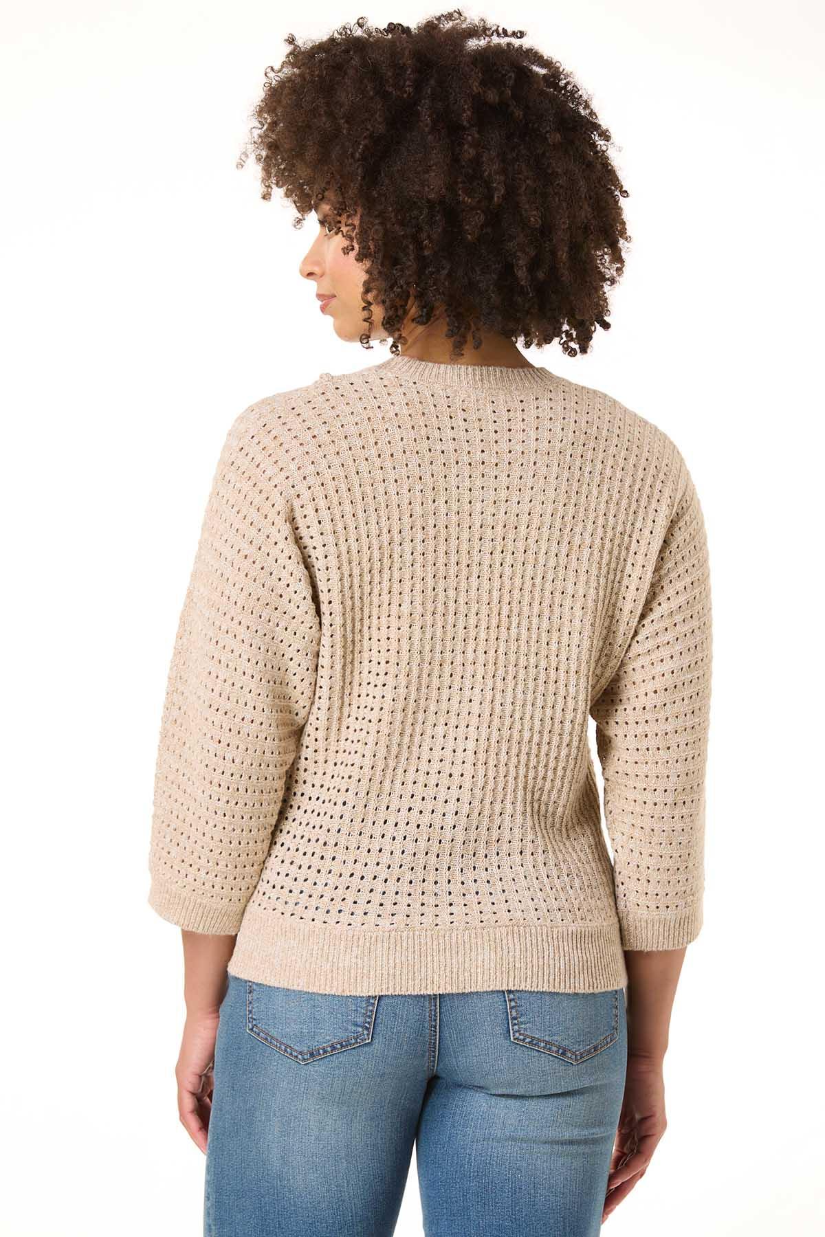 The cooler weather will have you crushing on this open stitch style, featuring a scoop neckline, relaxed fit, natural shade of beige and angled seam design. A cami or tank underneath and your favorite blue jeans will have you ready to take on those lower temps in a breeze.