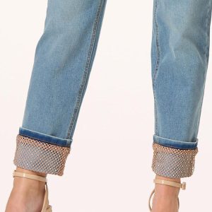 Classic jeans with a bit of bling. These ankle jeans bring the sparkle with cuffed hems that feature rhinestone embellished mesh. Pair them with a sleek blouse or a simple tee – let the cuffs do the talking.