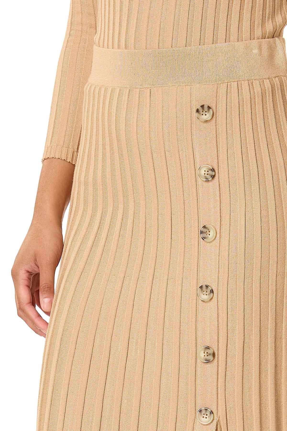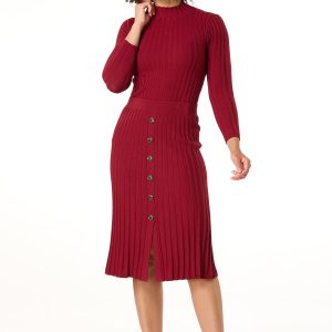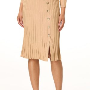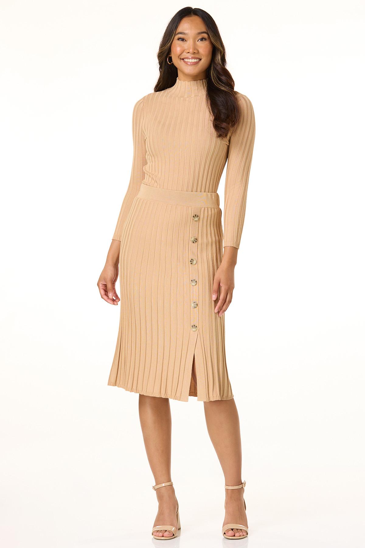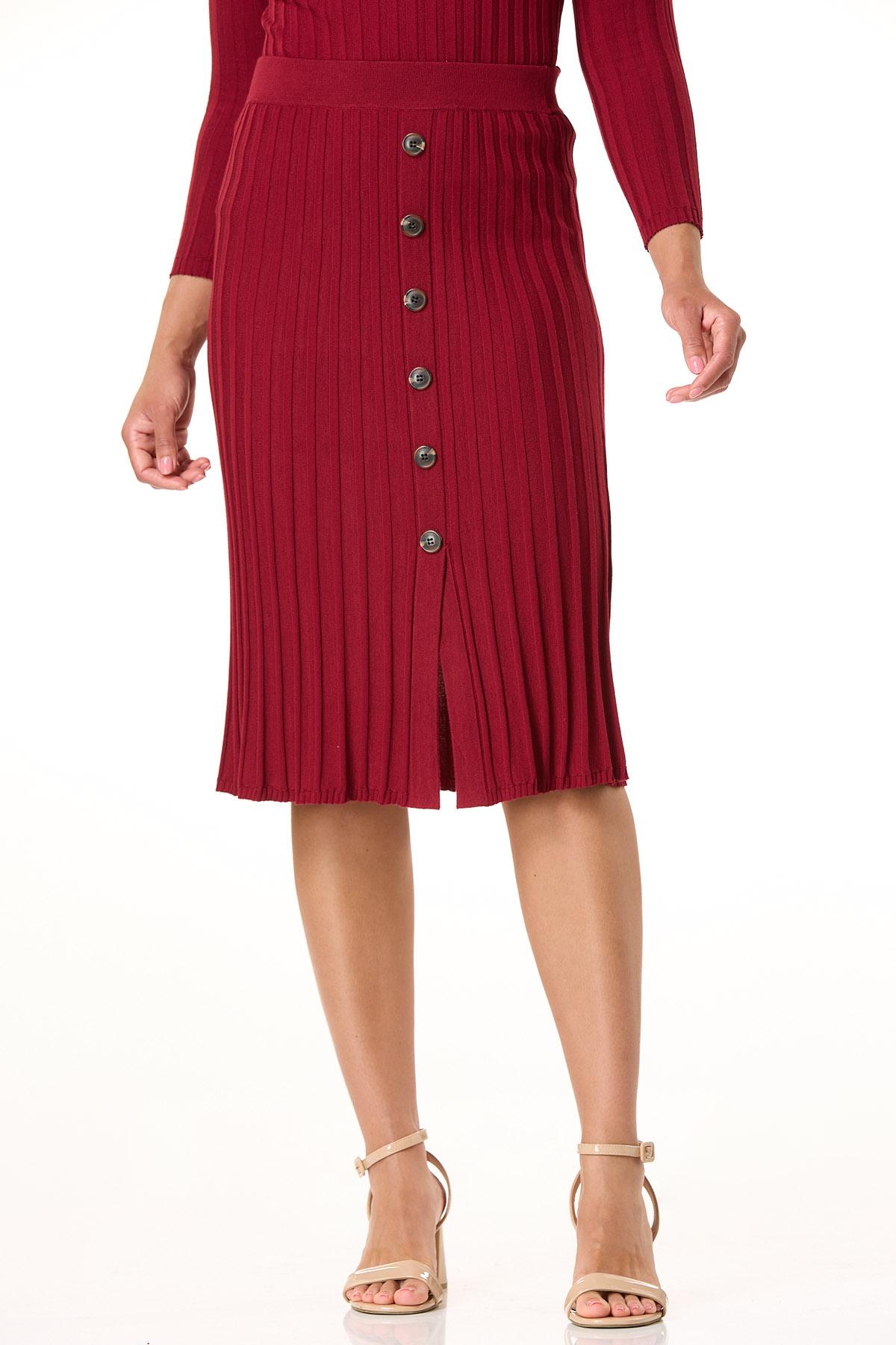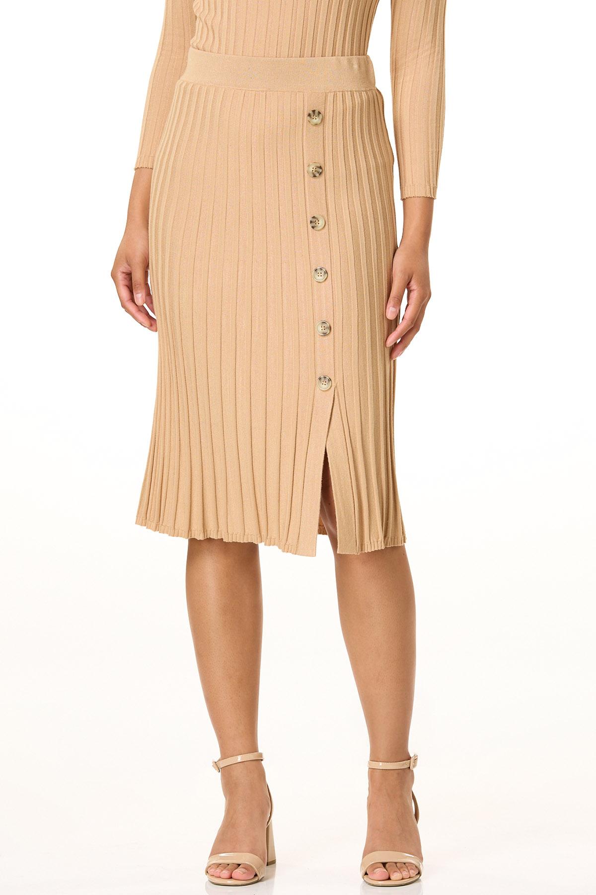 Fall quickly in love with the ribbed texture, solid hue and button front detail of this slimming skirt, featuring a pull-on waist, slit hem and warm-sweater knit for a look that is a perfect match to our ribbed mock neck sweater.