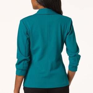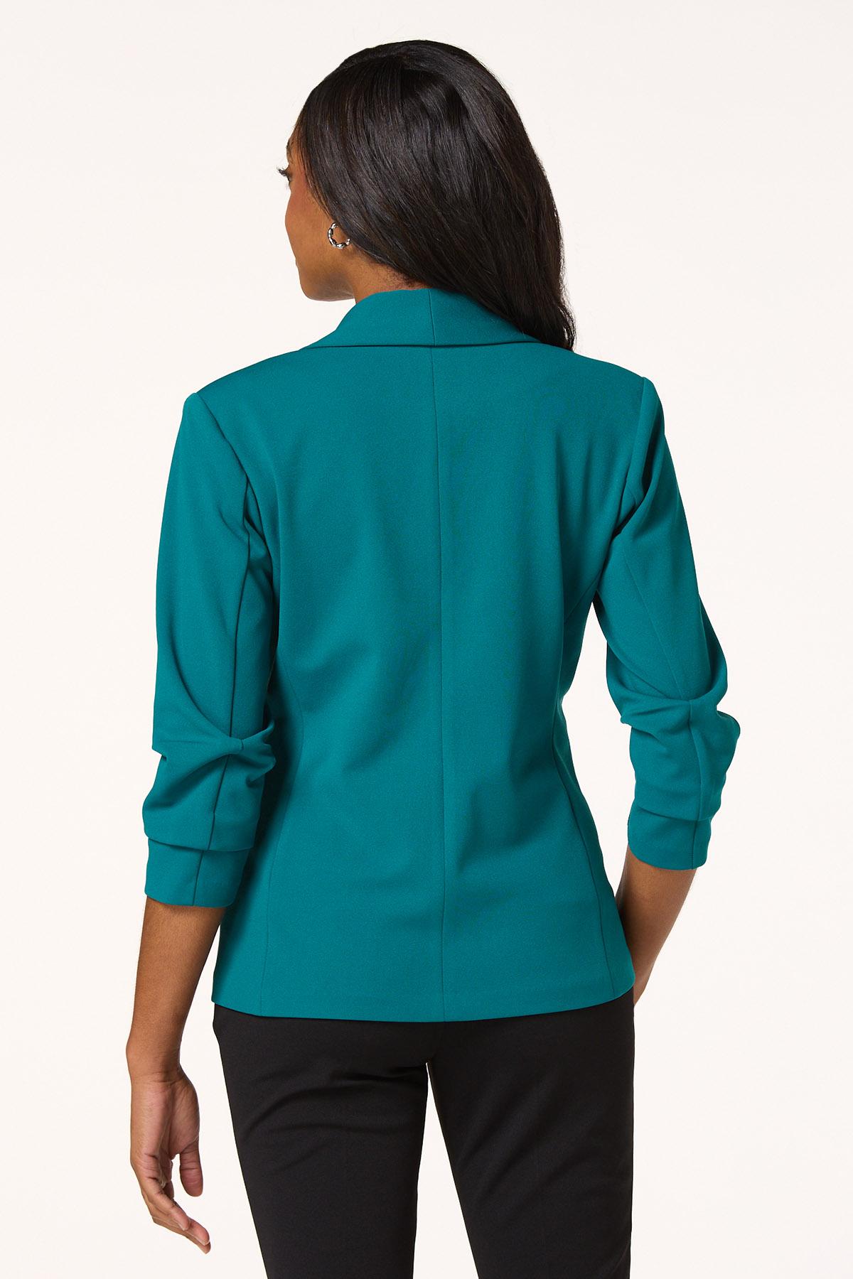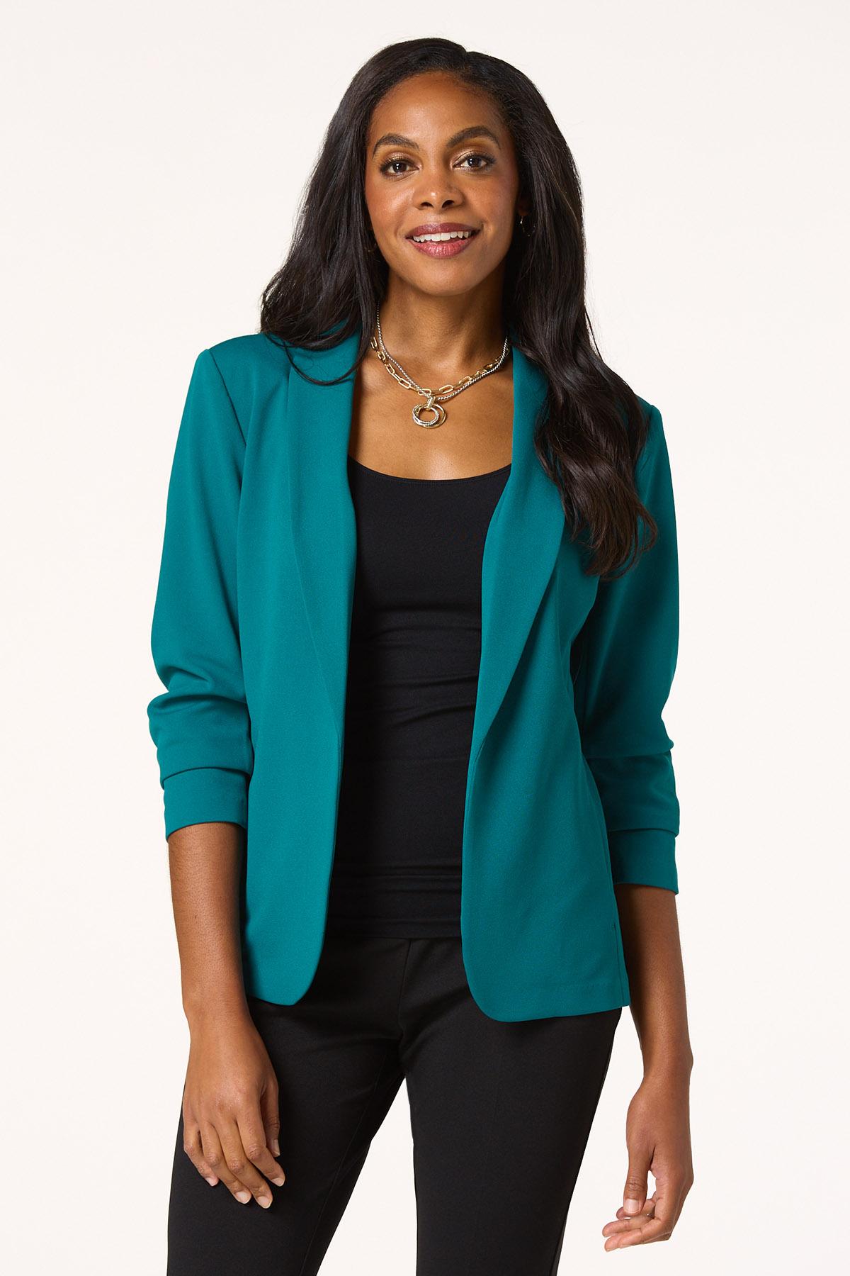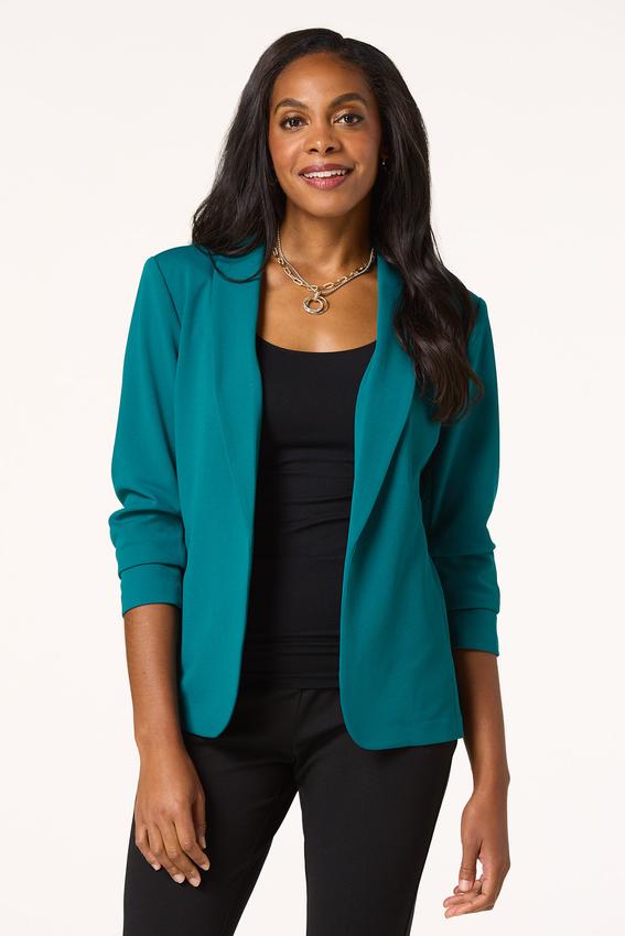 Elevate your style with the confident and polished look this layering piece brings. An open design, stretchy knit, side pockets and ruched sleeves are the details that make this one a favorite for work and play.