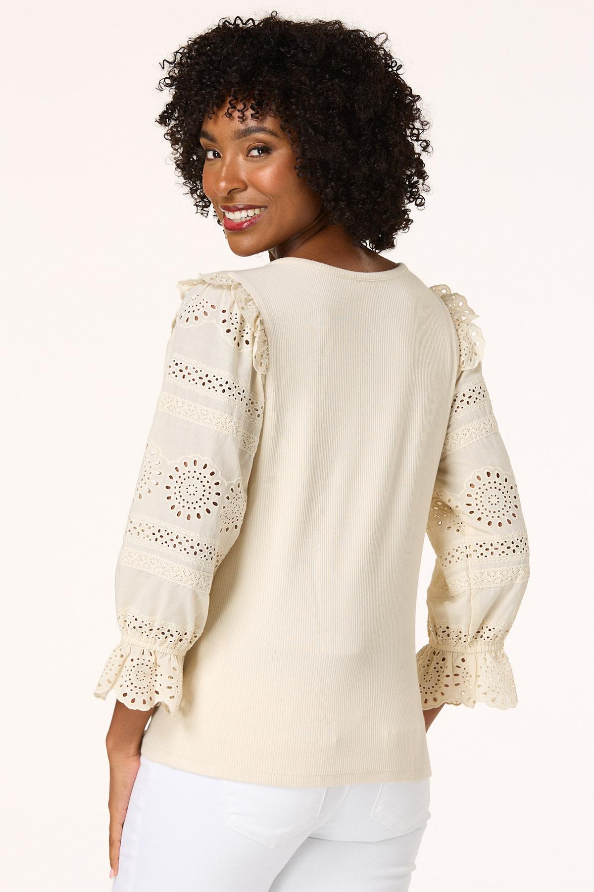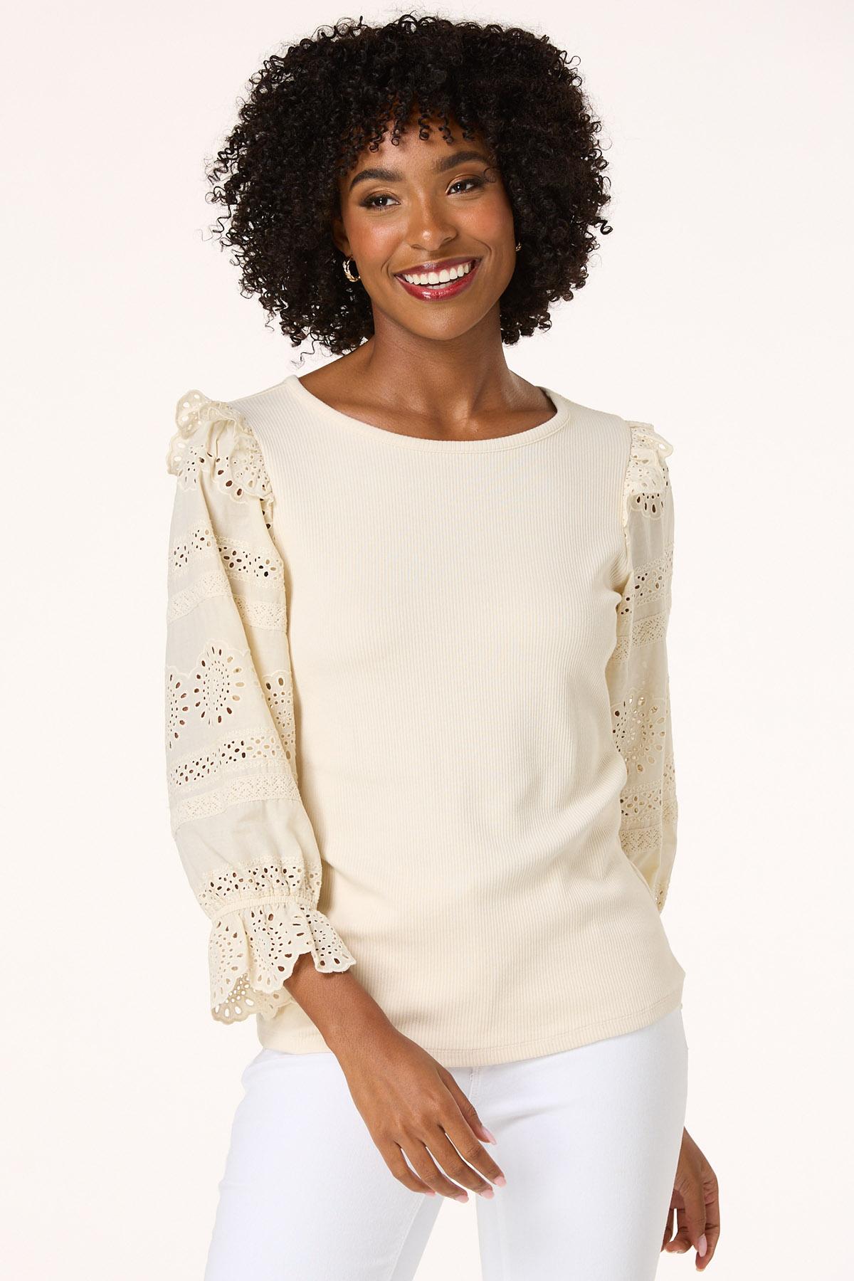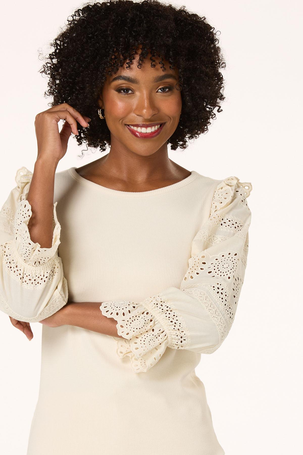 You’ll love the comfortable feel and cute, feminine vibe of this casual knit style, featuring eyelet sleeves, an ivory hue and stretchy, ribbed texture. An easy way to doll up denim and a perfect choice when casual plans, but still looking cute is the mood you’re going for.