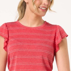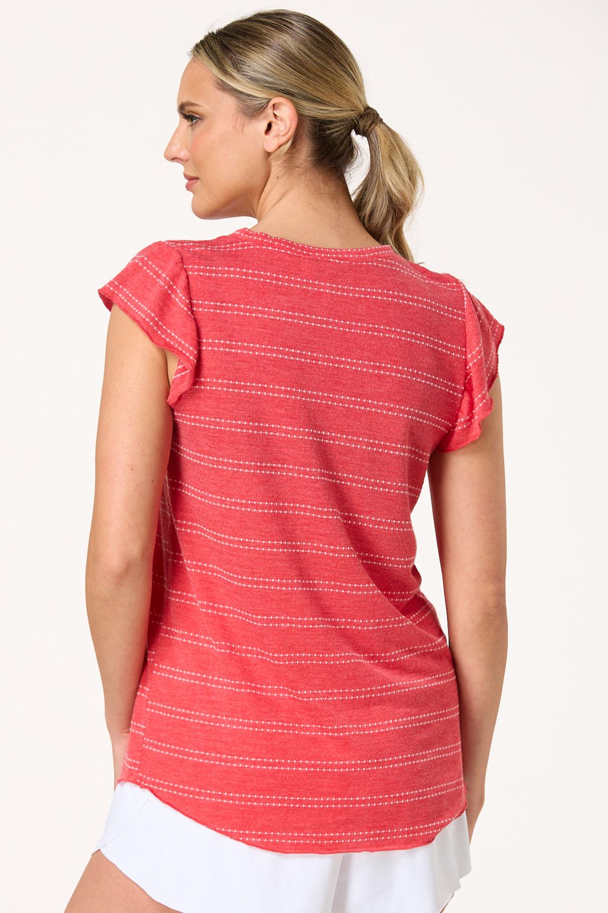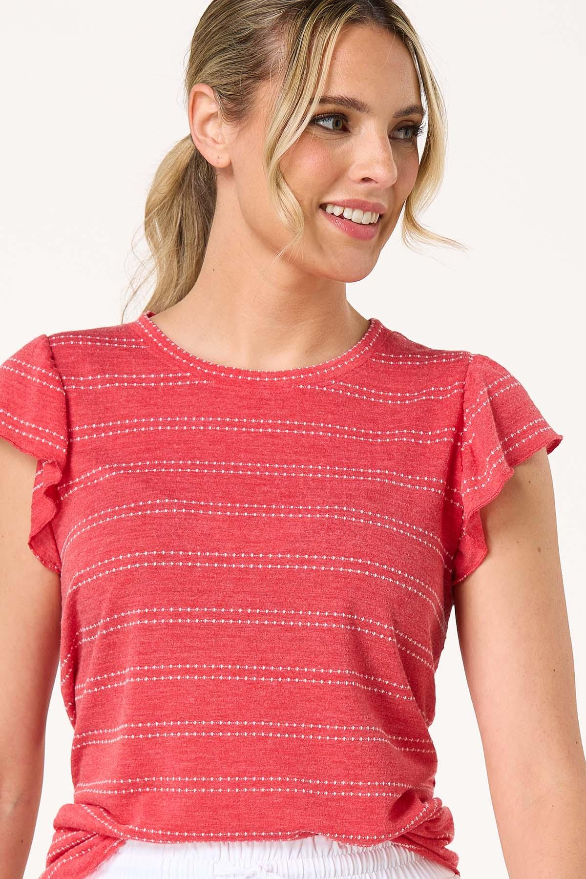 Look what just popped up – another cutie for your favorite denim styles. With a scoop neckline, dotted-stripe print, faded-red hue and super-soft feel, this sweet style is just perfect with jeans or adding a little pop of color to your favorite white bottoms.
