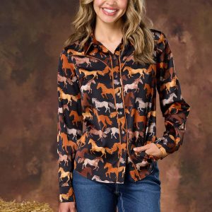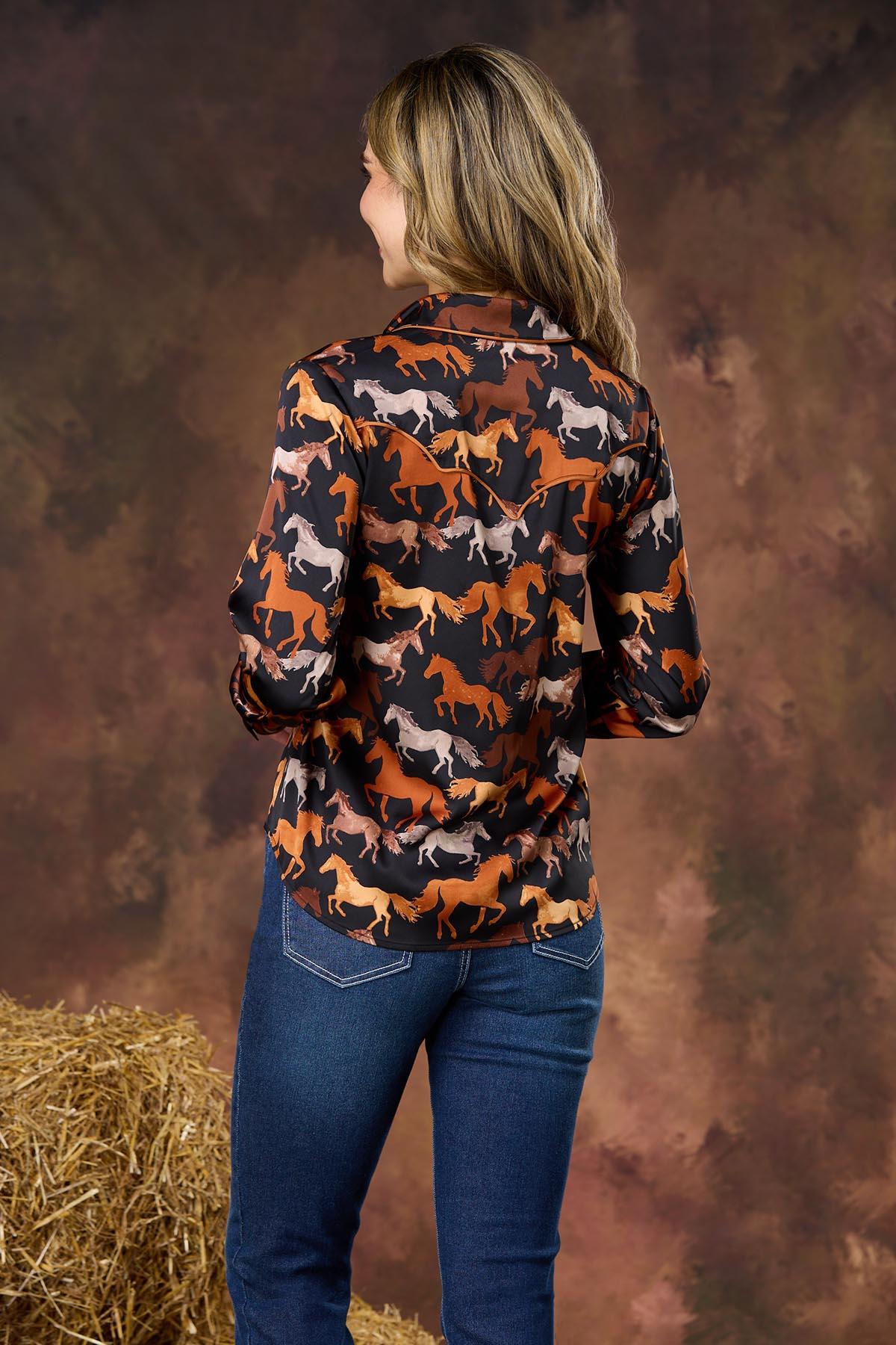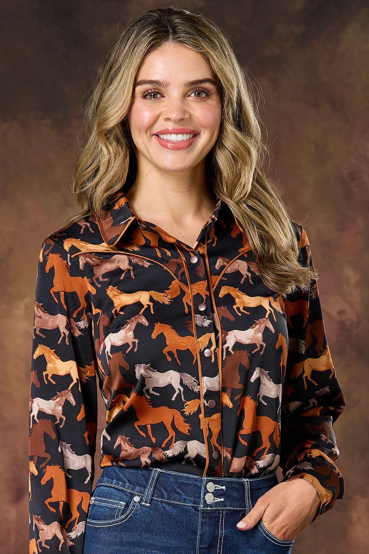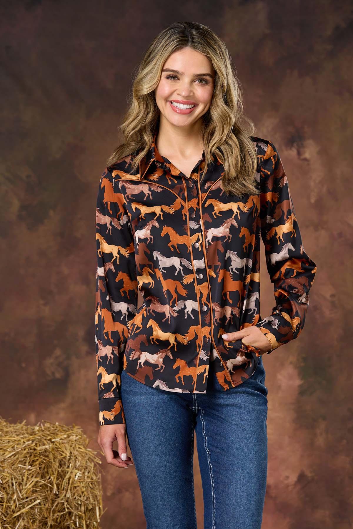Go rodeo and show up wearing this trending style, featuring a multi horse print, satiny-smooth finish, button down closure and a relaxed fit for style that’s meant for denim days, your favorite boots and fun, autumn afternoons and nights.