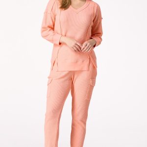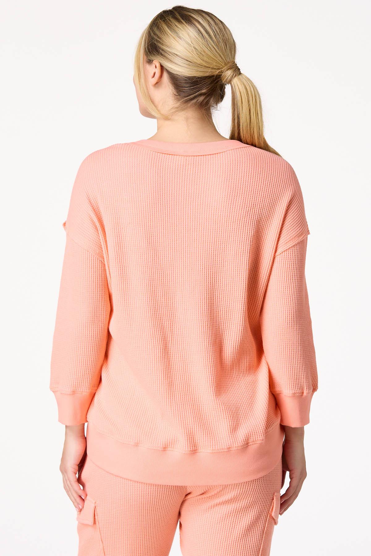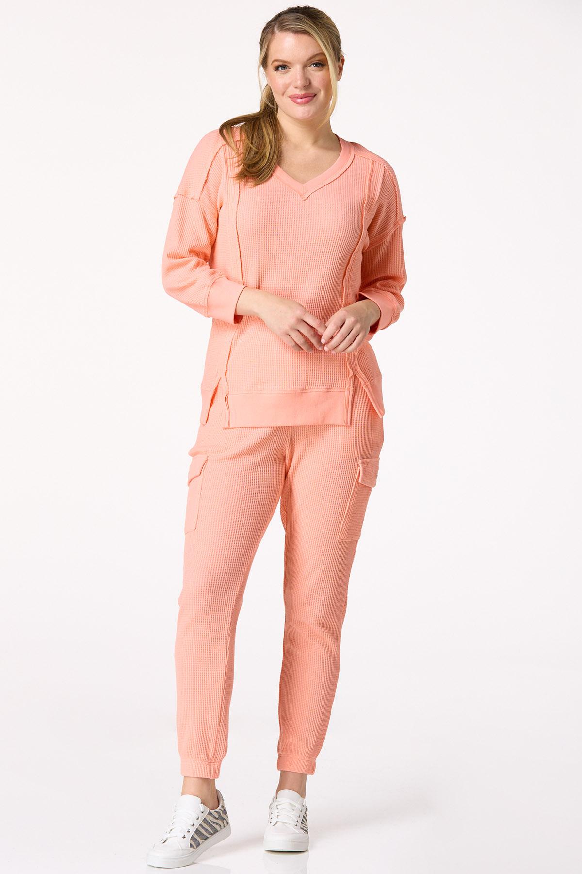 After a hard day at work this cozy style will be one you’ll want to turn to with its relaxed fit, soft-waffled knit, exposed seams and pretty-papaya hue for a sweet and cheerful finish.