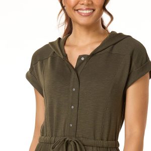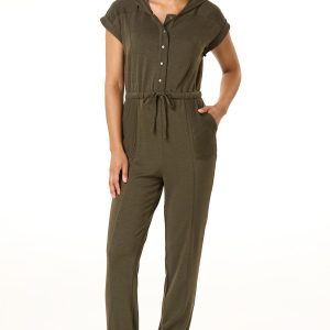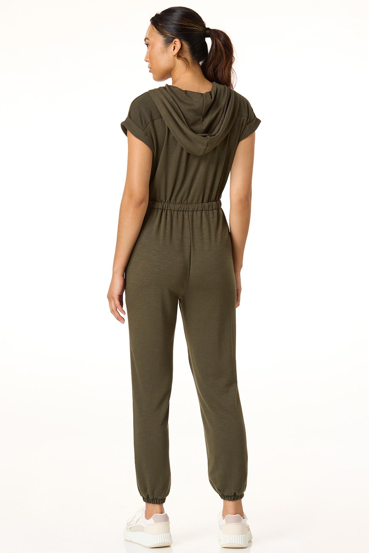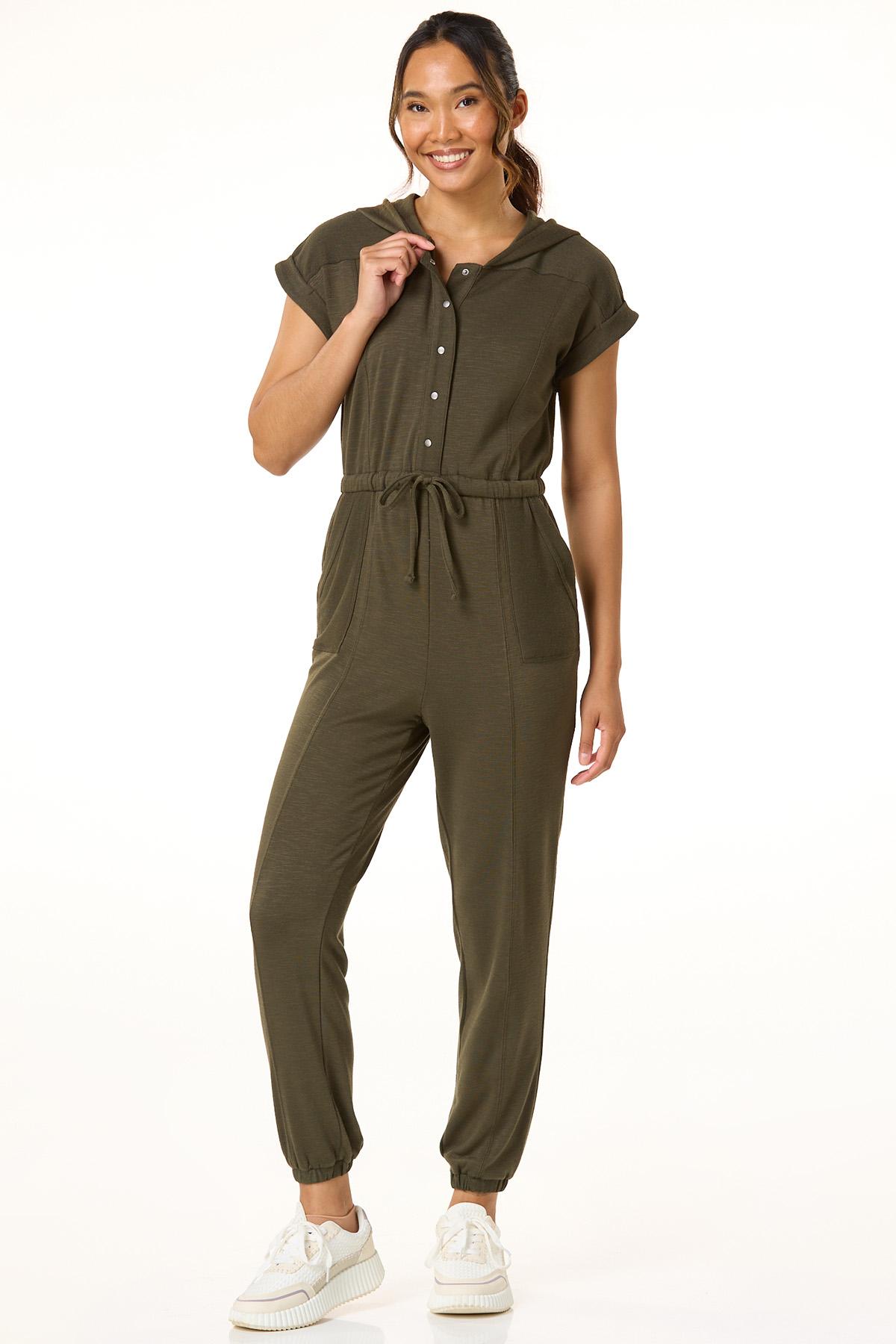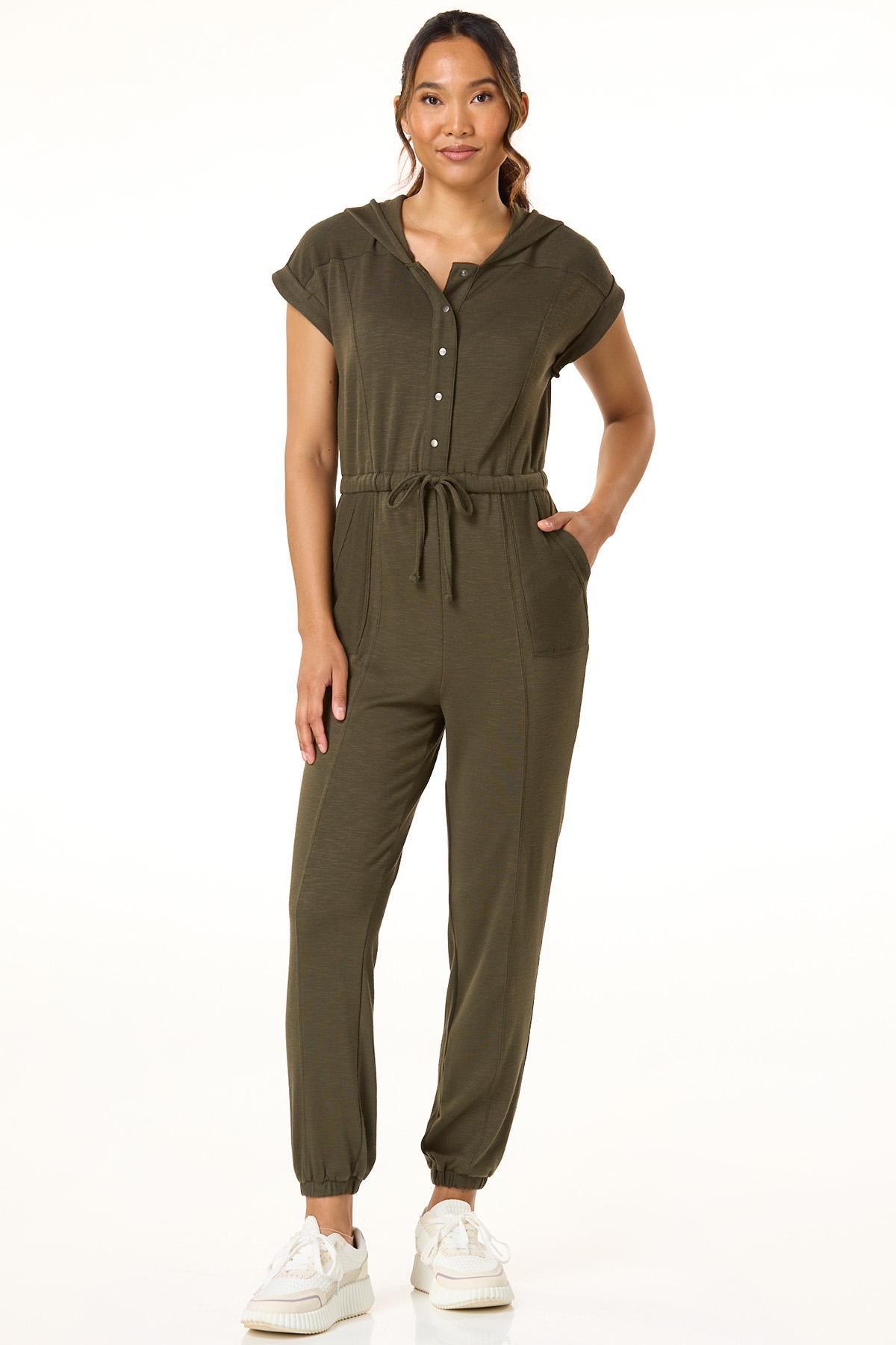 Easygoing style meets everyday comfort in this relaxed jumpsuit. With a partial snap-down front, drawstring waist, handy pockets, and a cozy hood, it’s made for movement and laid-back days. Finished in a calming green hue, it’s the ultimate one-and-done outfit.