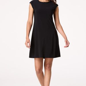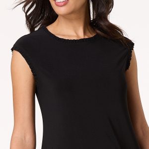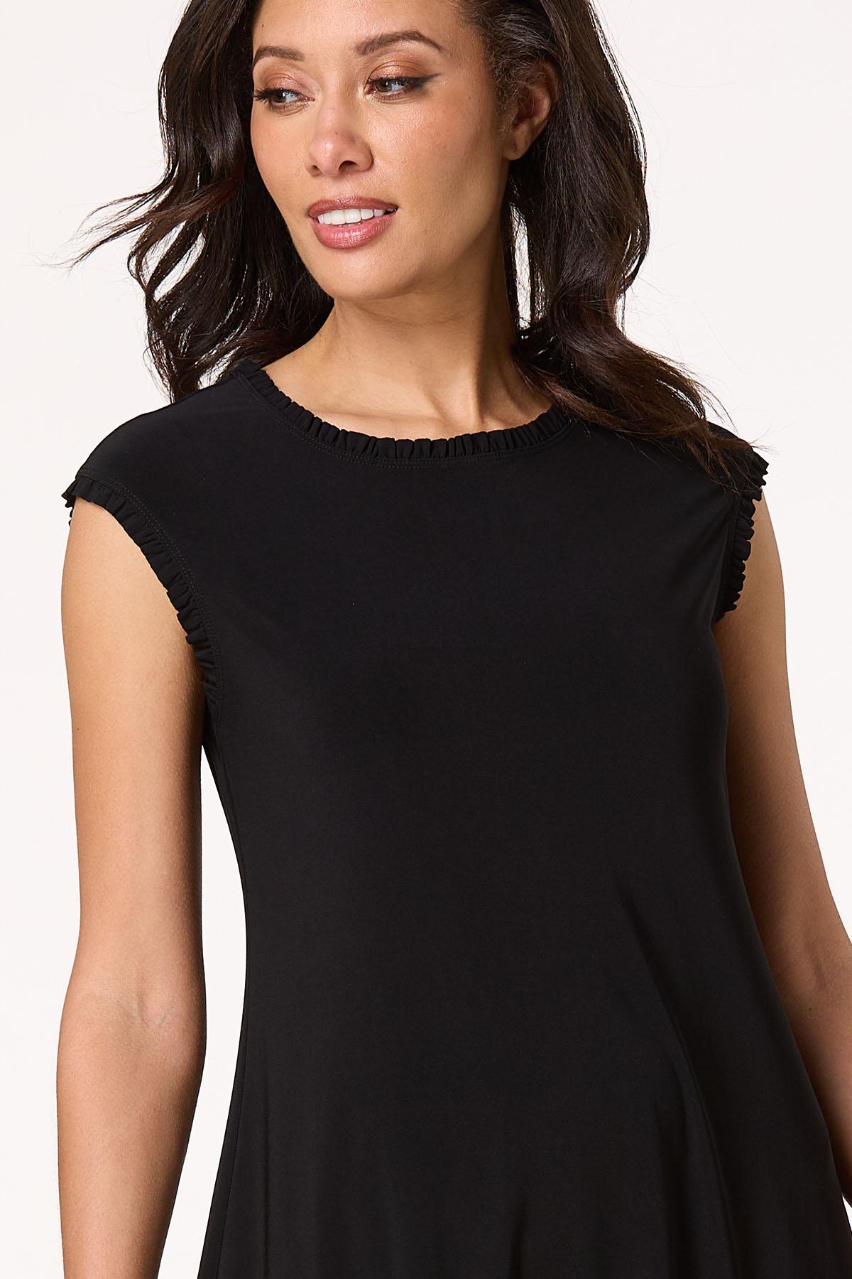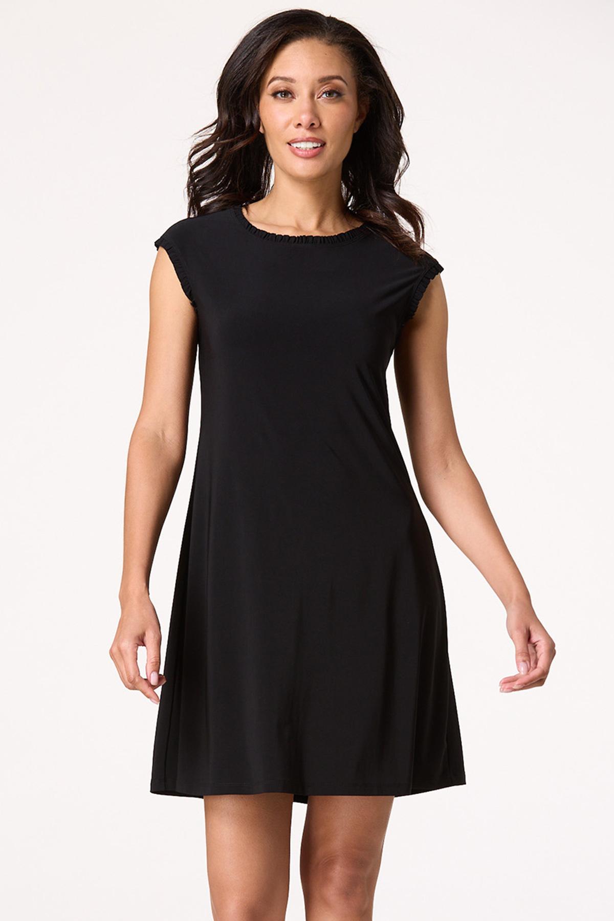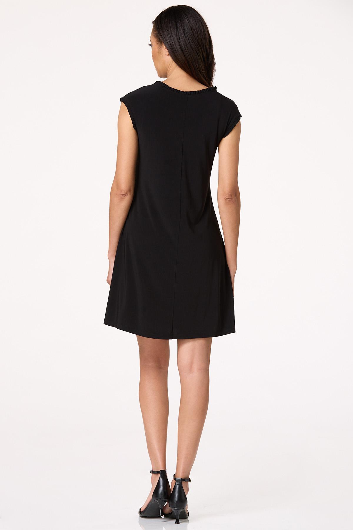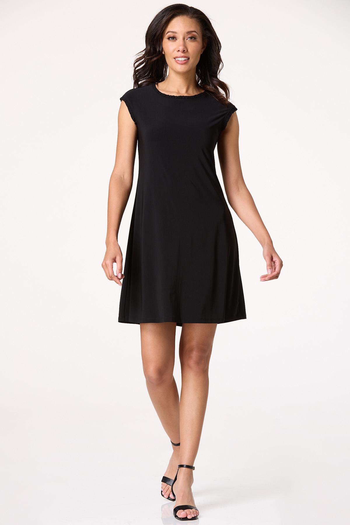 You can never go wrong with a little black dress and this precious piece certainly is no exception. A scoop neckline, ruffled trim, sleek-stretchy fit and solid-black hue come together for a sleeveless look you’ll be sure to love for date nights, dinner and those special moments under the sun.