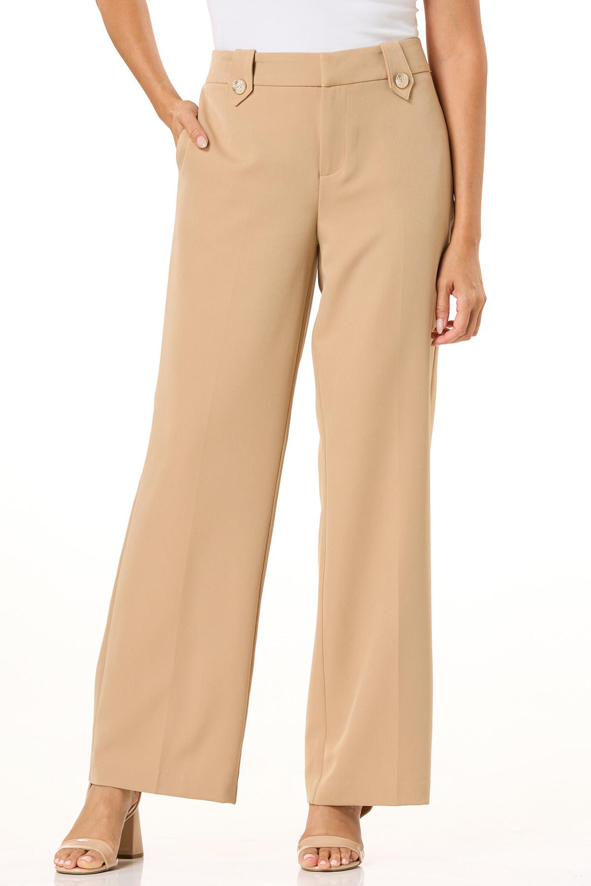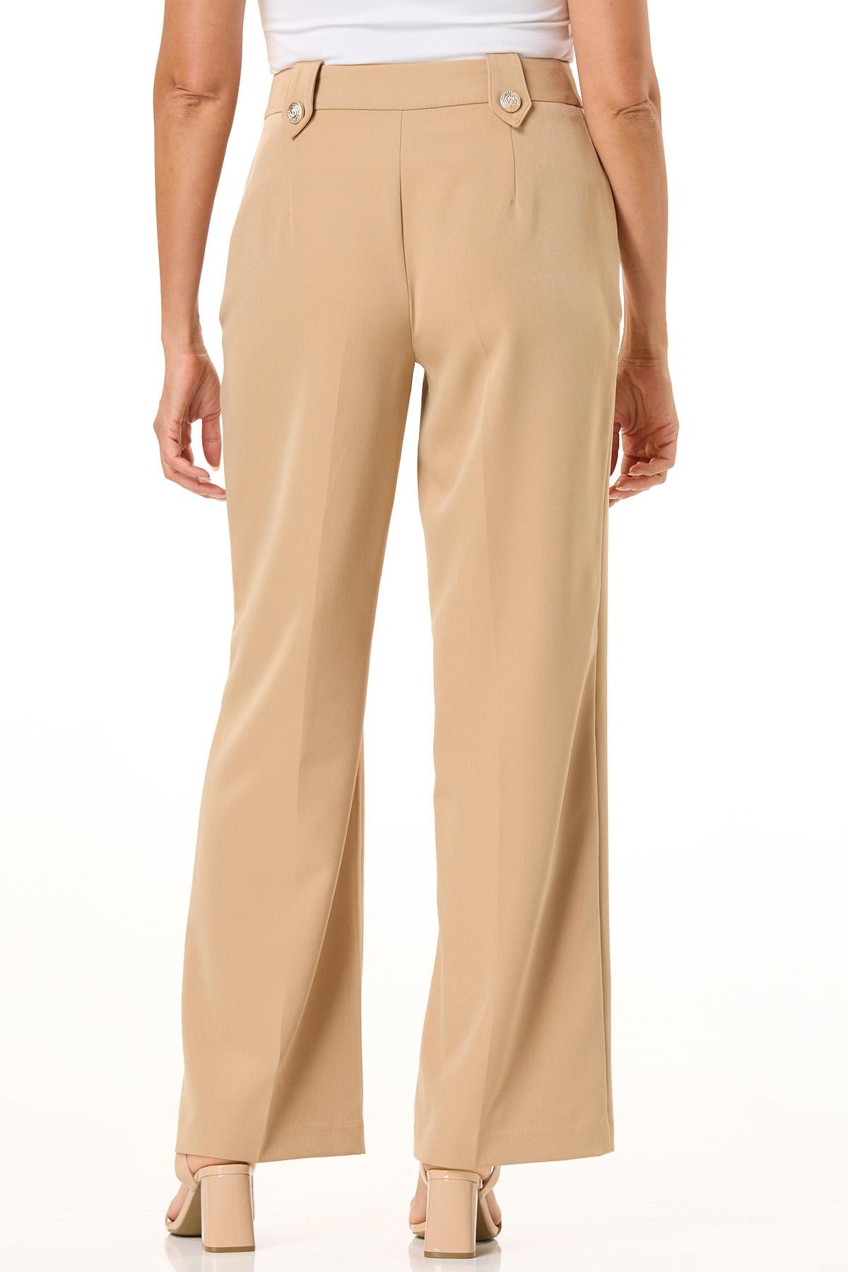 Dress for success, while looking amazing and confident, too. This wide leg silhouette has a slight stretch, neutral hue and button tab detail in a shiny, gold finish. Pair with a classic button down or one of our solid looks for an effortless vibe that’s ready to take on the day.