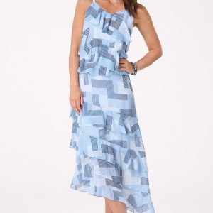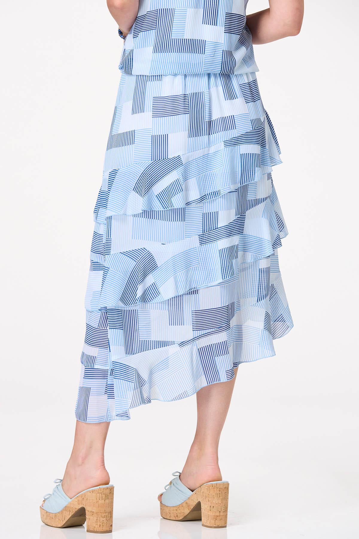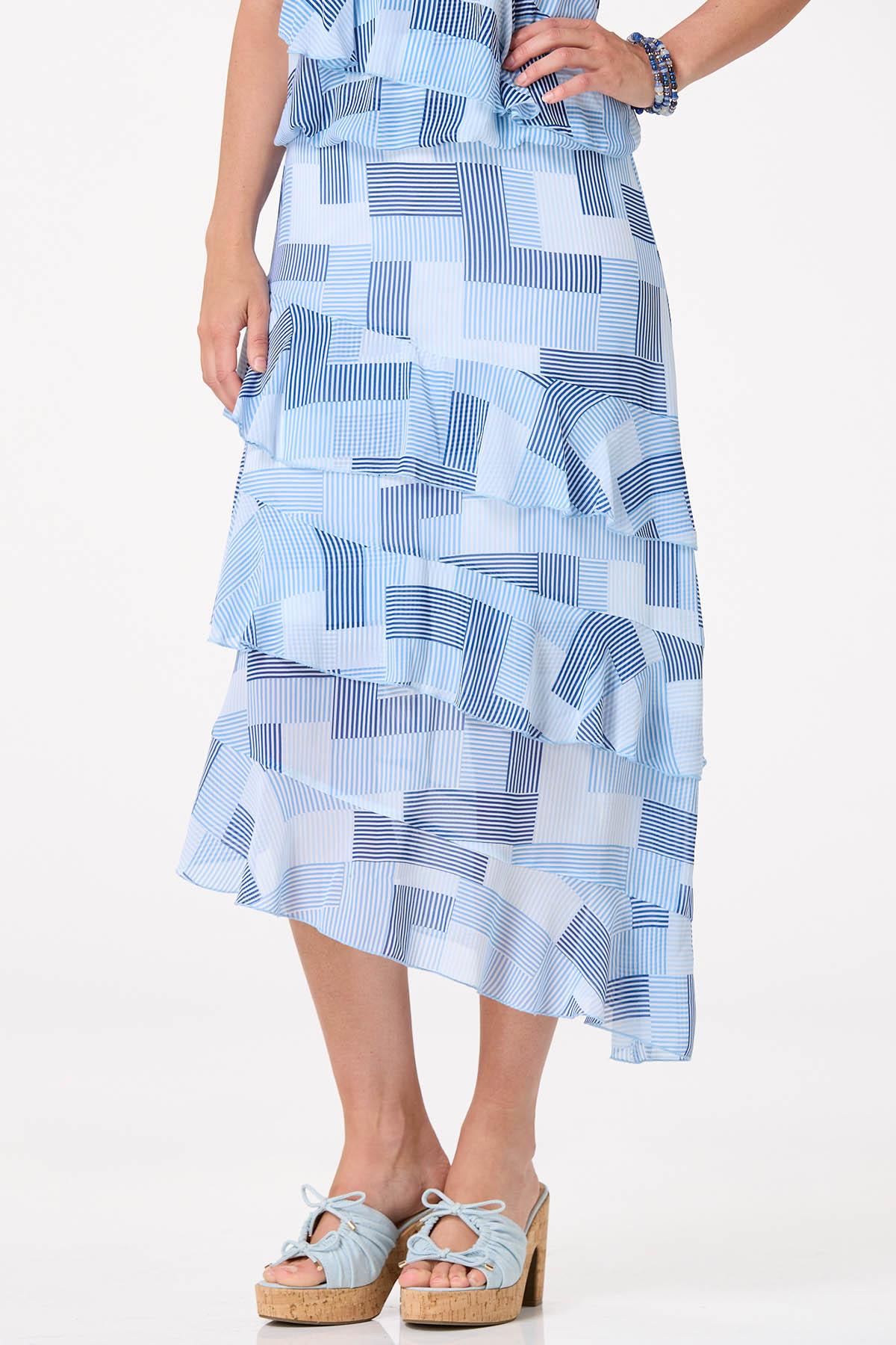 Chasing those sunsets starts now. With a stretchy, pull-on waist, asymmetrical-ruffled design, mixed stripe print and beautiful shades of blue, this dreamy skirt is perfect for a basic white tank or paired with our matching top.