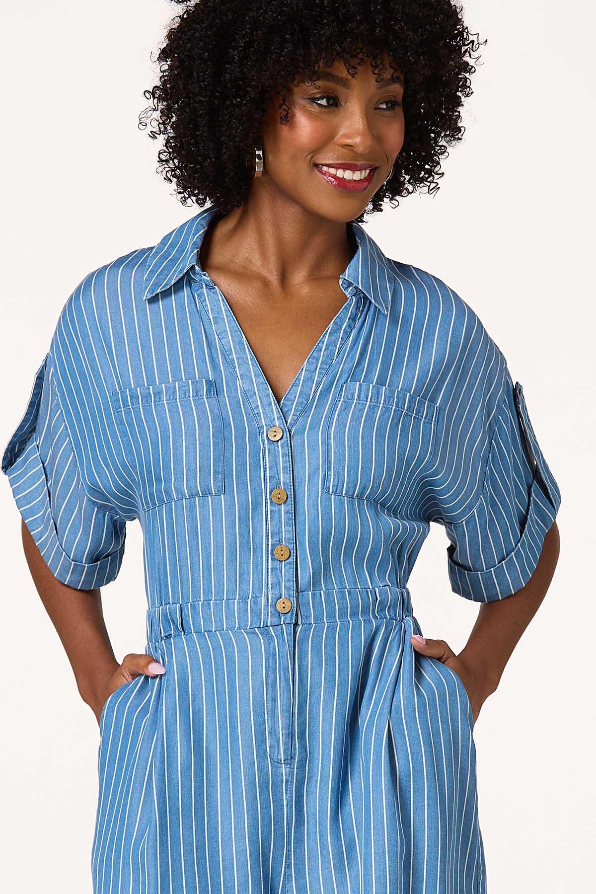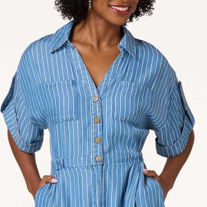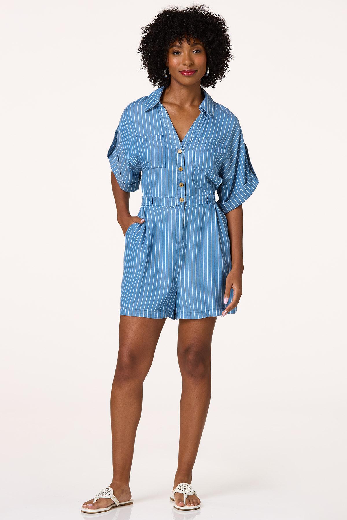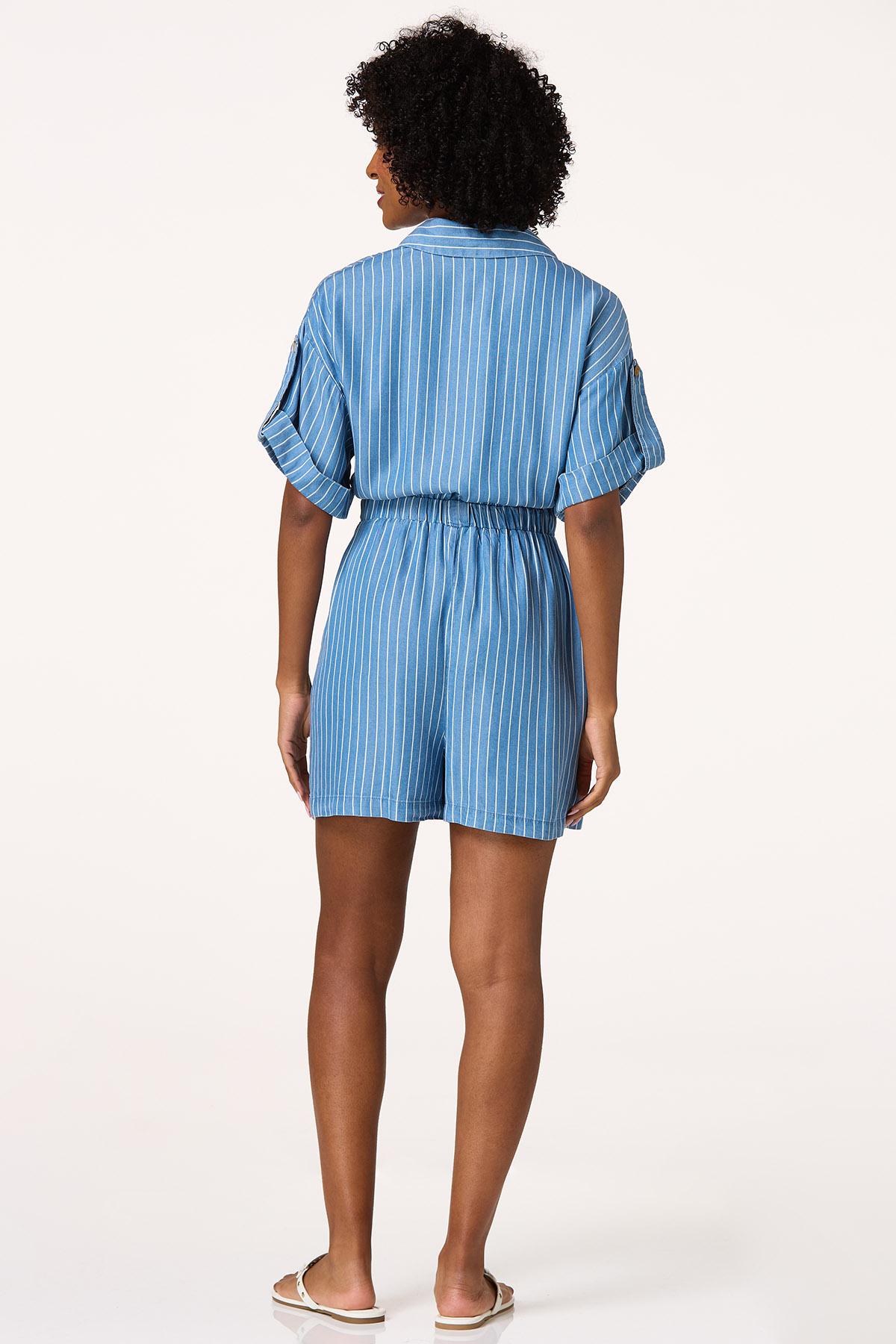 You’ll love the adorable look and comfortable feel of this cute romper, featuring a classic-collared neckline, brown button closure, stretchy waist and stripe print. Front pockets, roll tab sleeves and a relaxed fit are topped by a denim-blue hue and lightweight-chambray fabric for style that’s fit for sun, fun and compliments for days.
