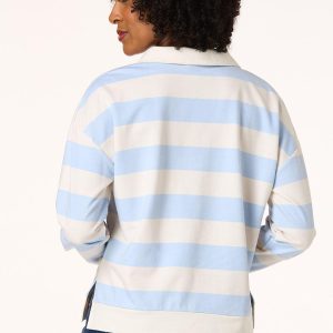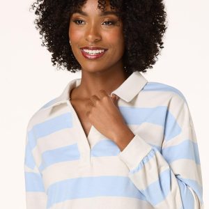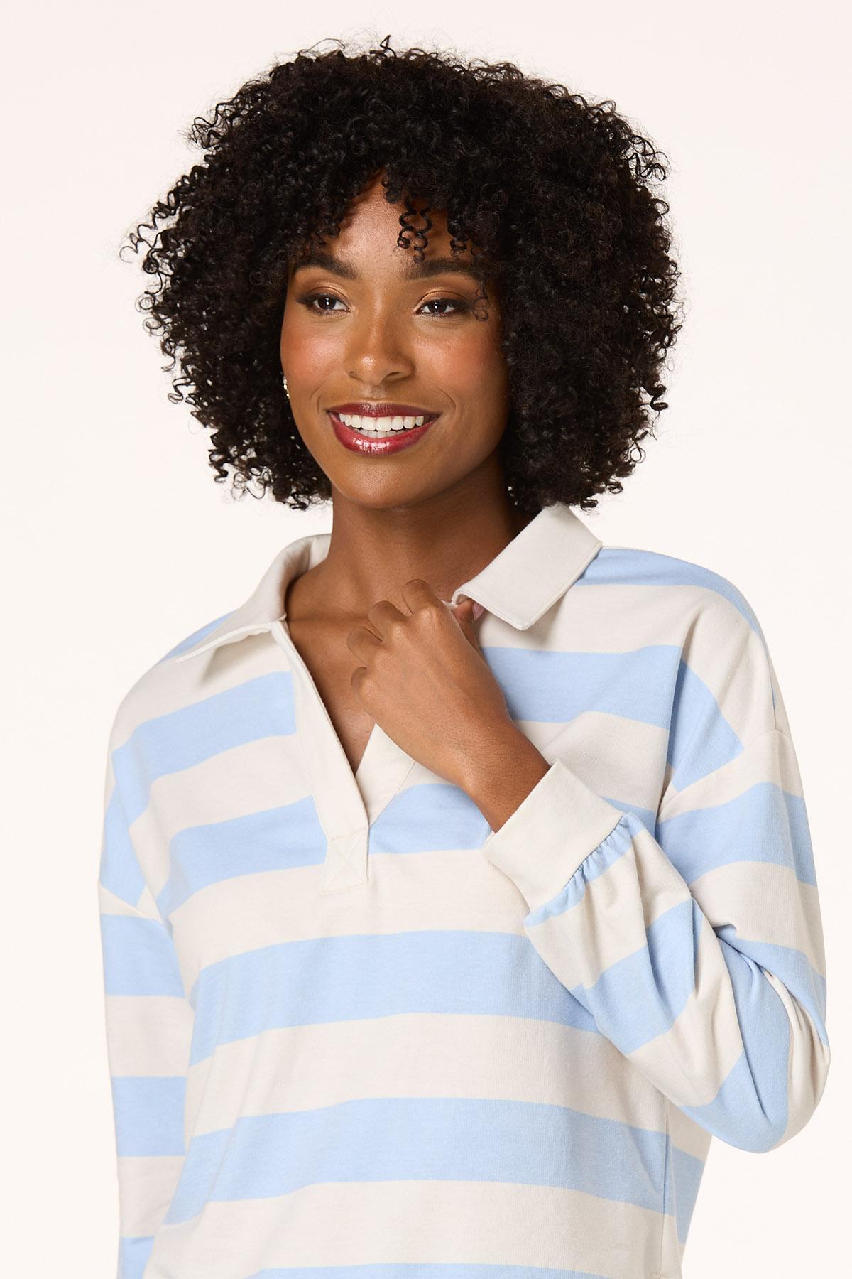 Find yourself loving the timeless and retro feel this rugby brings with its collared, v-neckline, wide-stripe print, side slit hem and soft blue and ivory color palette.