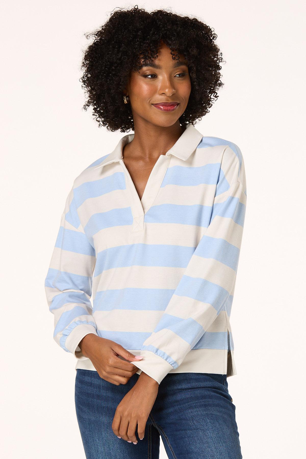 Find yourself loving the timeless and retro feel this rugby brings with its collared, v-neckline, wide-stripe print, side slit hem and soft blue and ivory color palette.