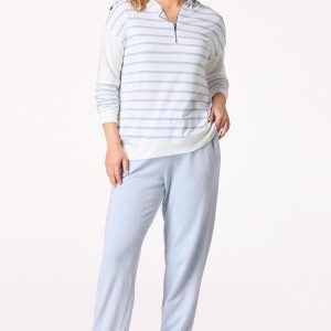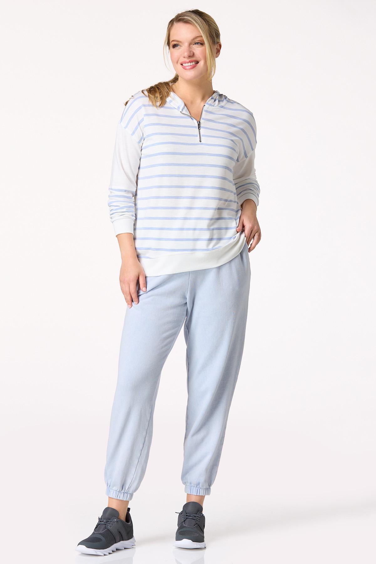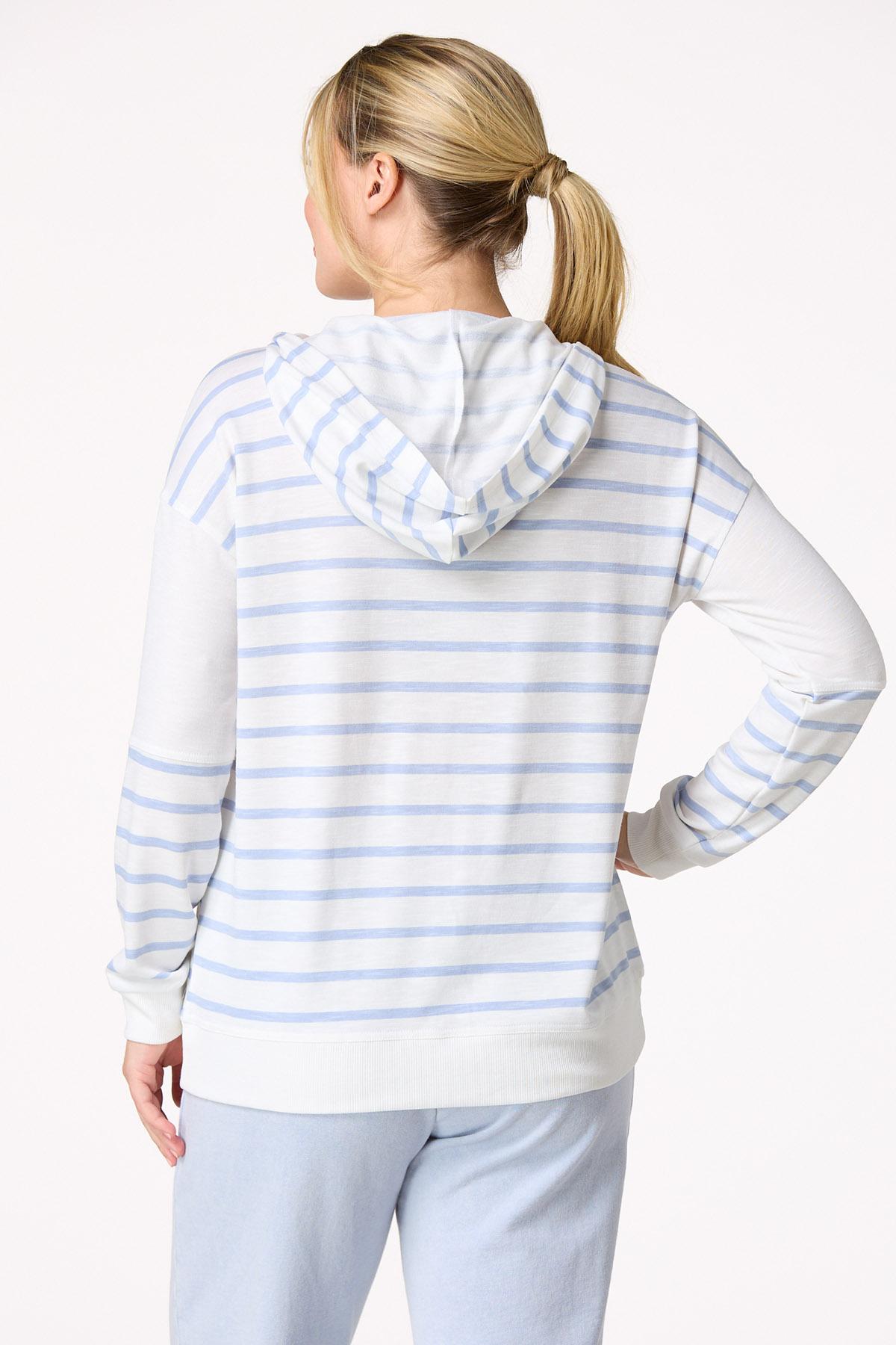 Casual conversations with a cup of coffee were made for this comfy, low-key look. A hooded design meets a partial zip neckline, while a pretty, blue-stripe print and soft-stretch fit make it a favorite choice for a pair of jeans or those lived-in leggings.