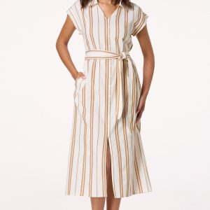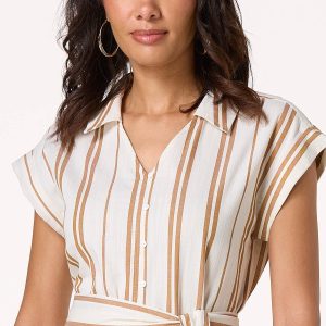 You’ll want to make this midi a must when you head into the office or an afternoon out with friends. Shades of beige top off a collared neckline, button front, cuffed sleeves and belted-tie waist for a timeless and so-chic finish.
