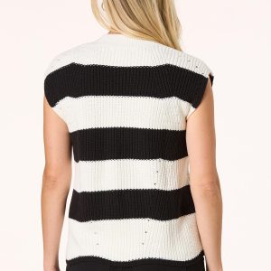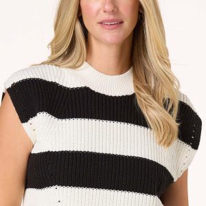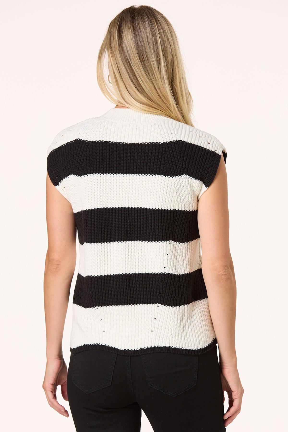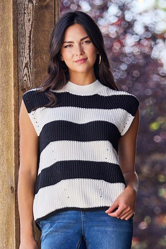 A striped sweater for the cooler weather is always a good idea and this sleeveless style is the perfect piece to transition into the season effortlessly. Shades of ivory and black, a chunky knit, mock neckline and relaxed fit are the details that will have you loving this look with denim.