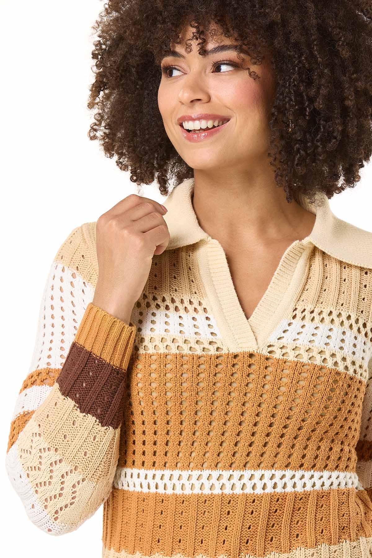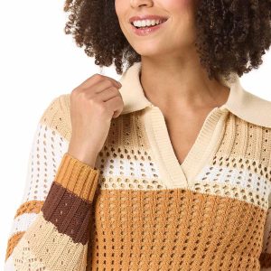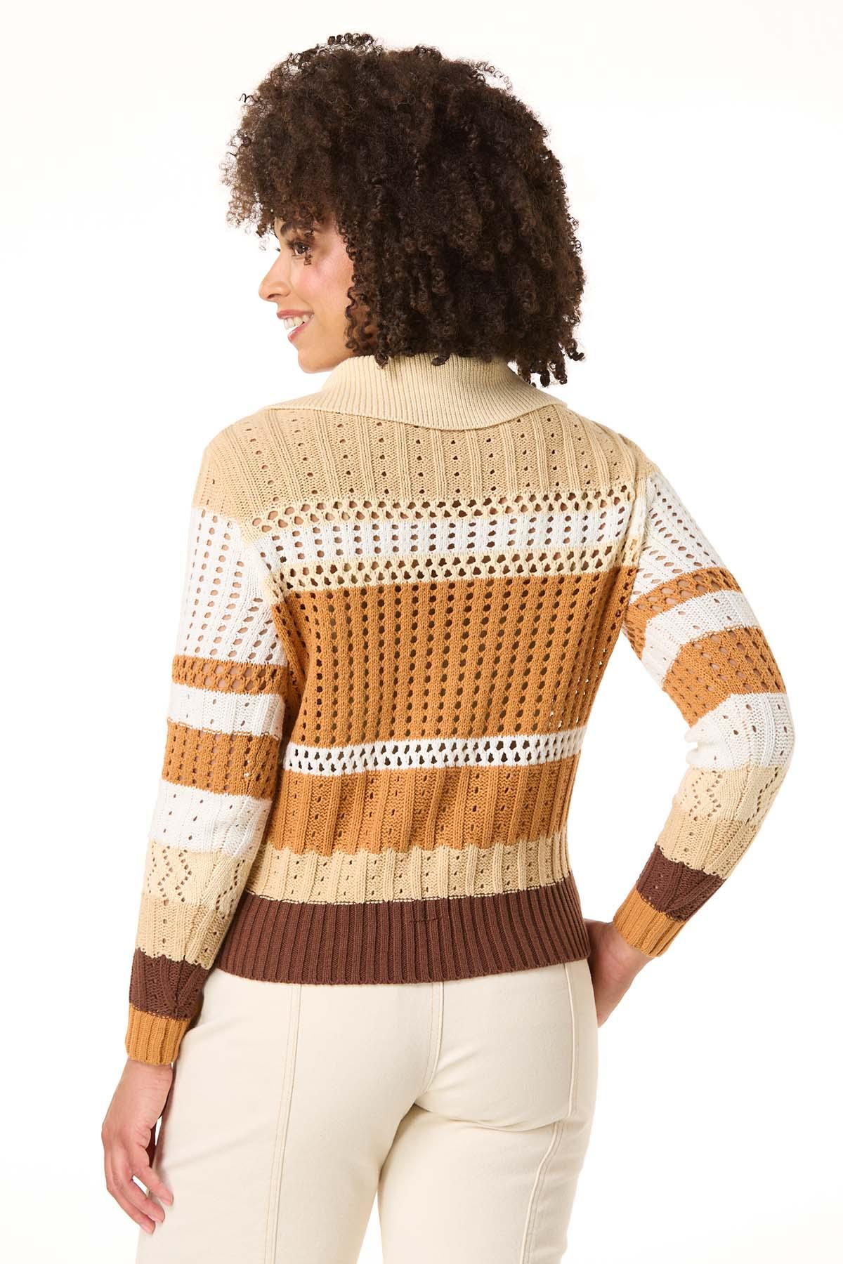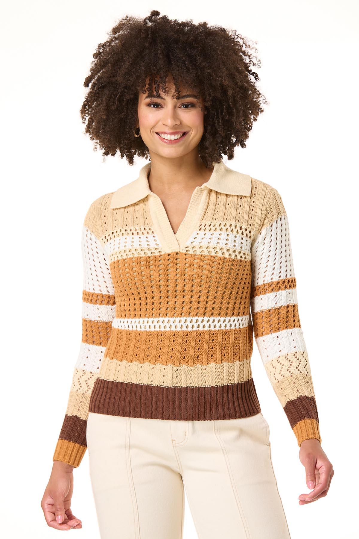 You’ll be fitting right into the season with this one. Pair your favorite jeans and boots with this open-stitch sweater, featuring a collared notched neckline, colorblock stripes, a relaxed fit, and warm beige tones – perfect for that caramel latte kind of morning.