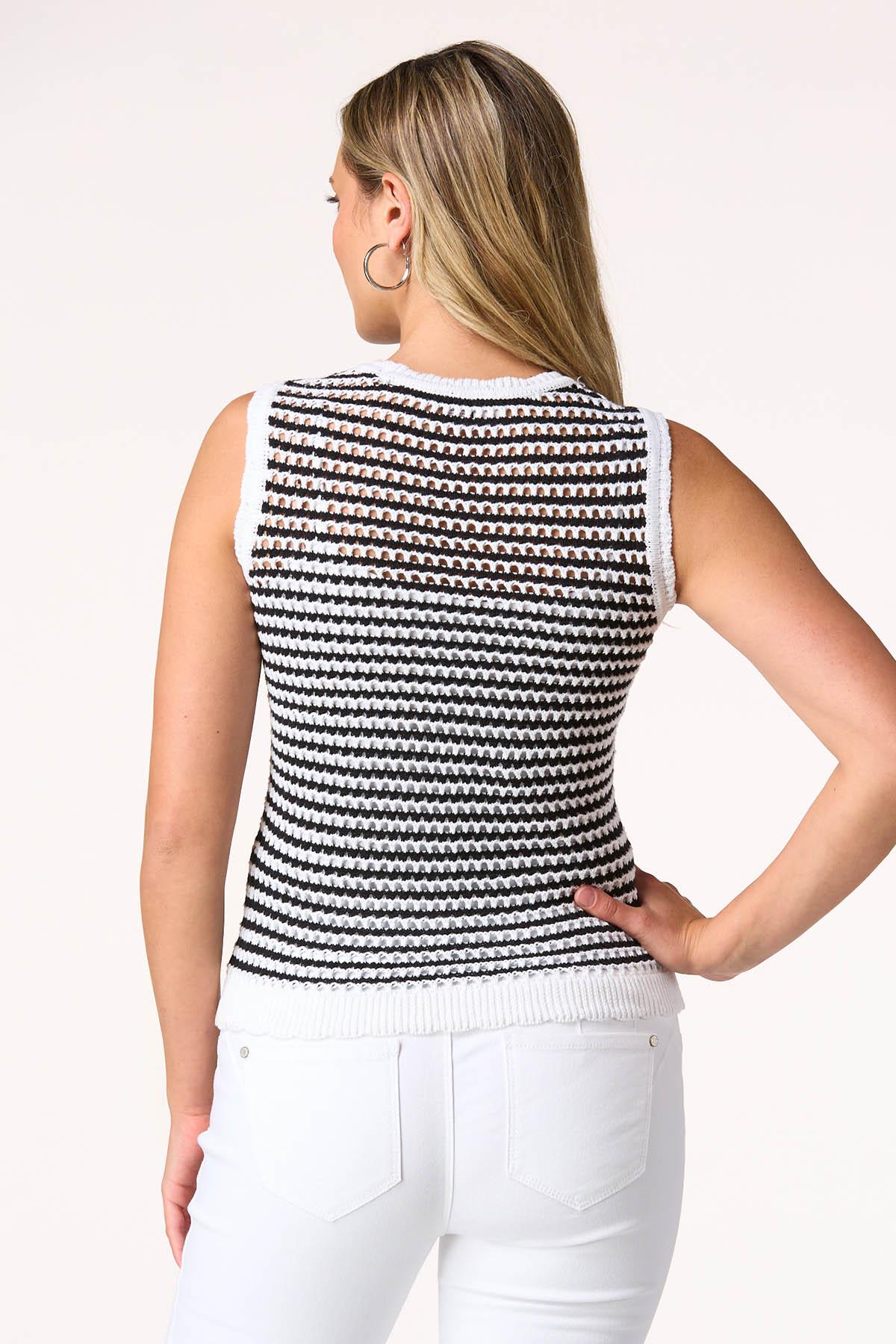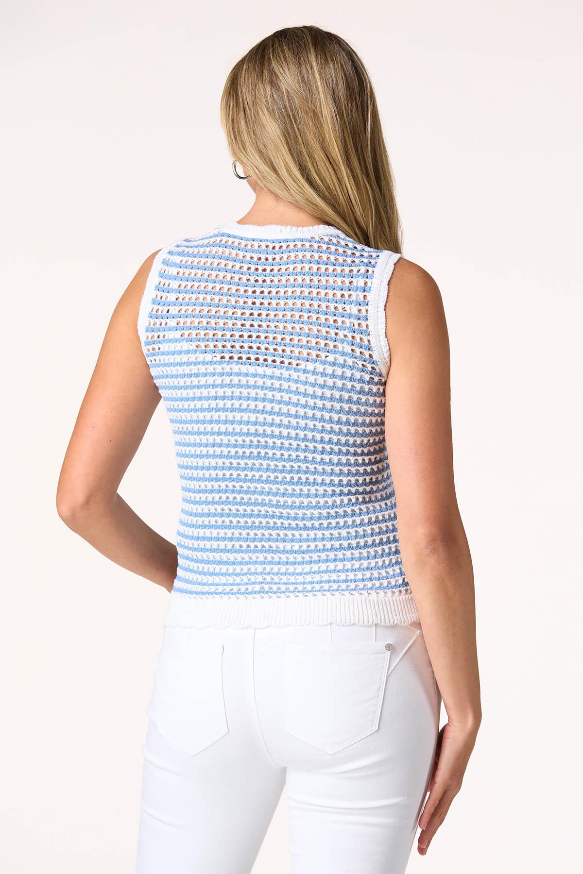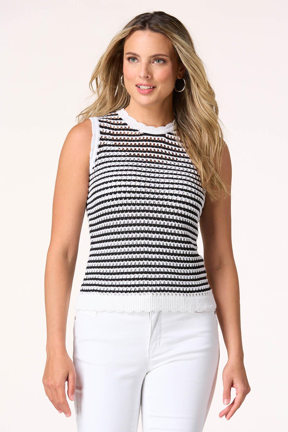 We’re looping you in to a trending look with this open stitch style. Contrasting shades and a chic-scalloped trim bring a sweet vibe to this cool, summer sweater.