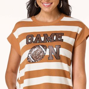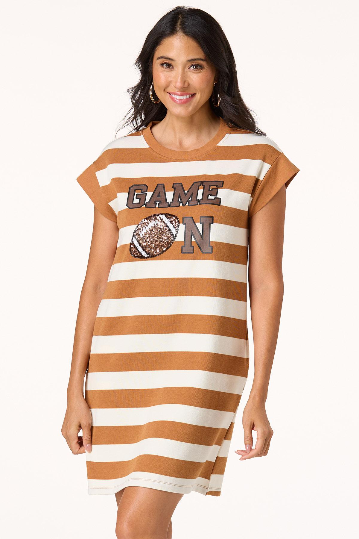It’s a total win for your wardrobe with this one. A scoop neckline, wide stripe pattern, side pockets and a comfortable fabric are topped by neutral shades and a “Game On” graphic with a sparkling-sequin football.