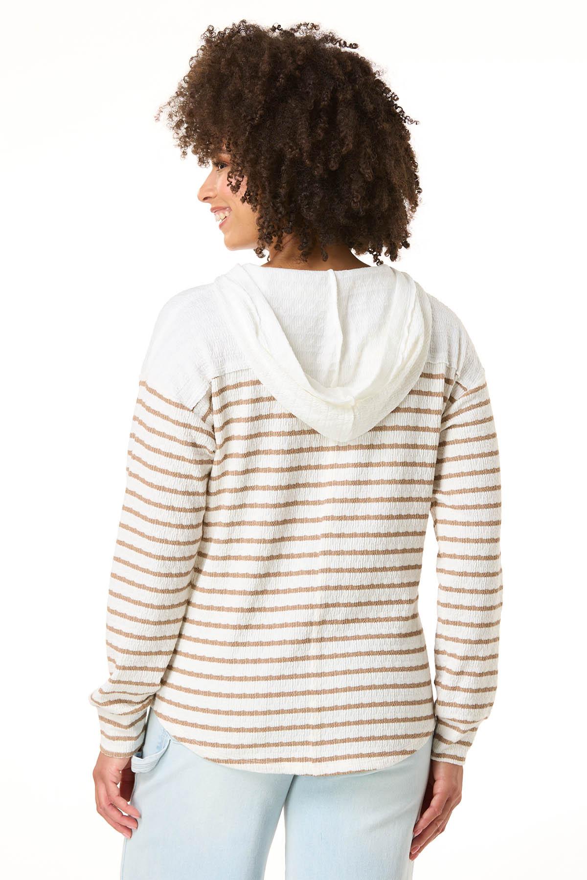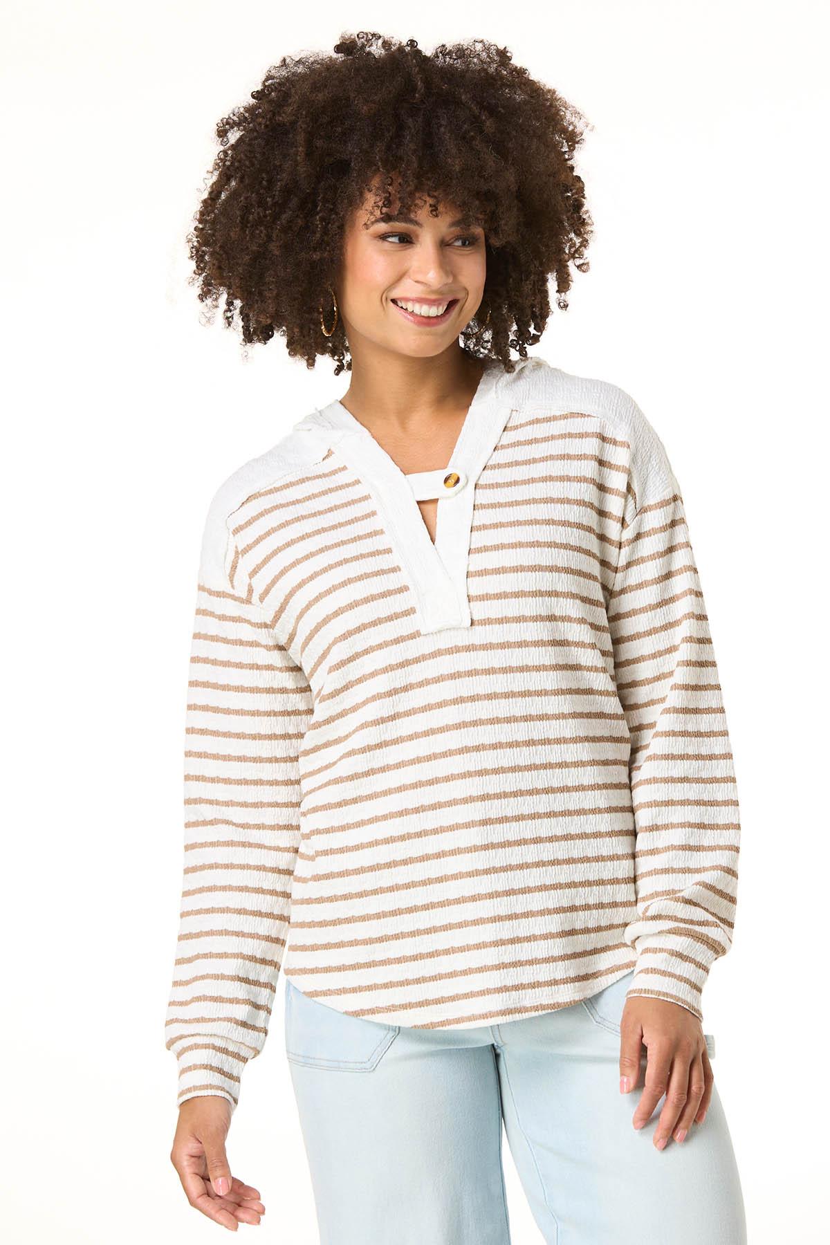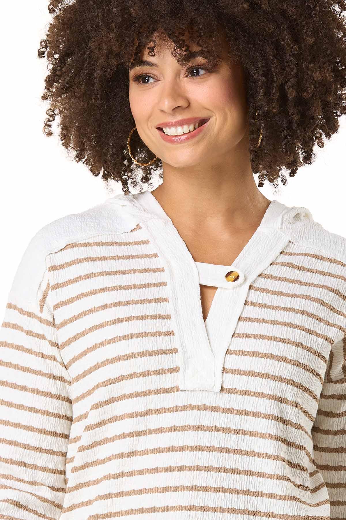 Relax and unwind with this casual and classic style. Starting with a relaxed hooded design and continuing with a notch tab neckline, and textured stripes in soft, natural beige tones. This look is one you’ll find yourself wearing on repeat.