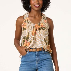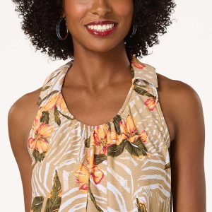 Go ahead and pretend your on island time with this sleeveless style, featuring a tropical-floral print, collared neckline, ribbed texture and easy-breezy fit for a cool, summer-ready vibe that’s coming in hot. Pair with white bottoms, denim shorts or our matching pants for a variety of looks to fit your mood.