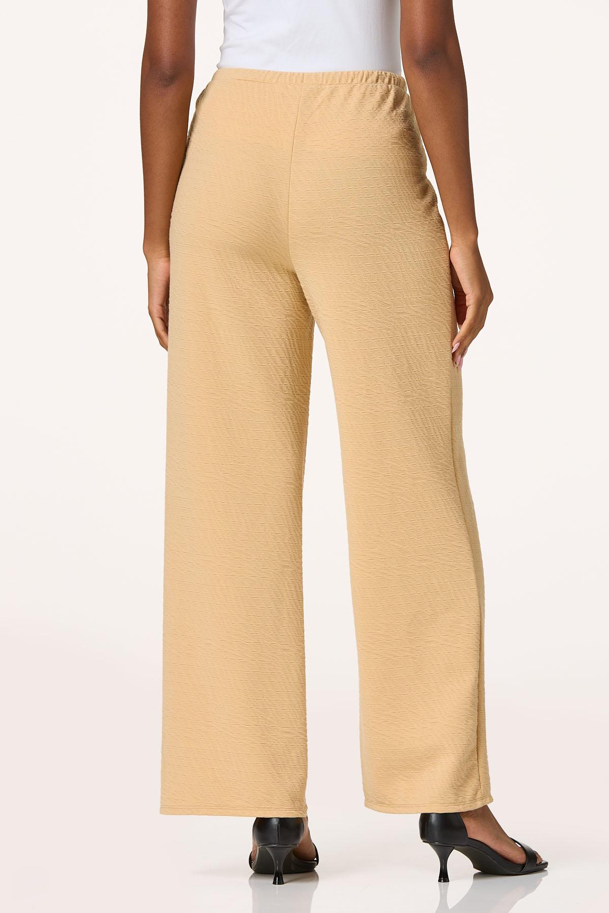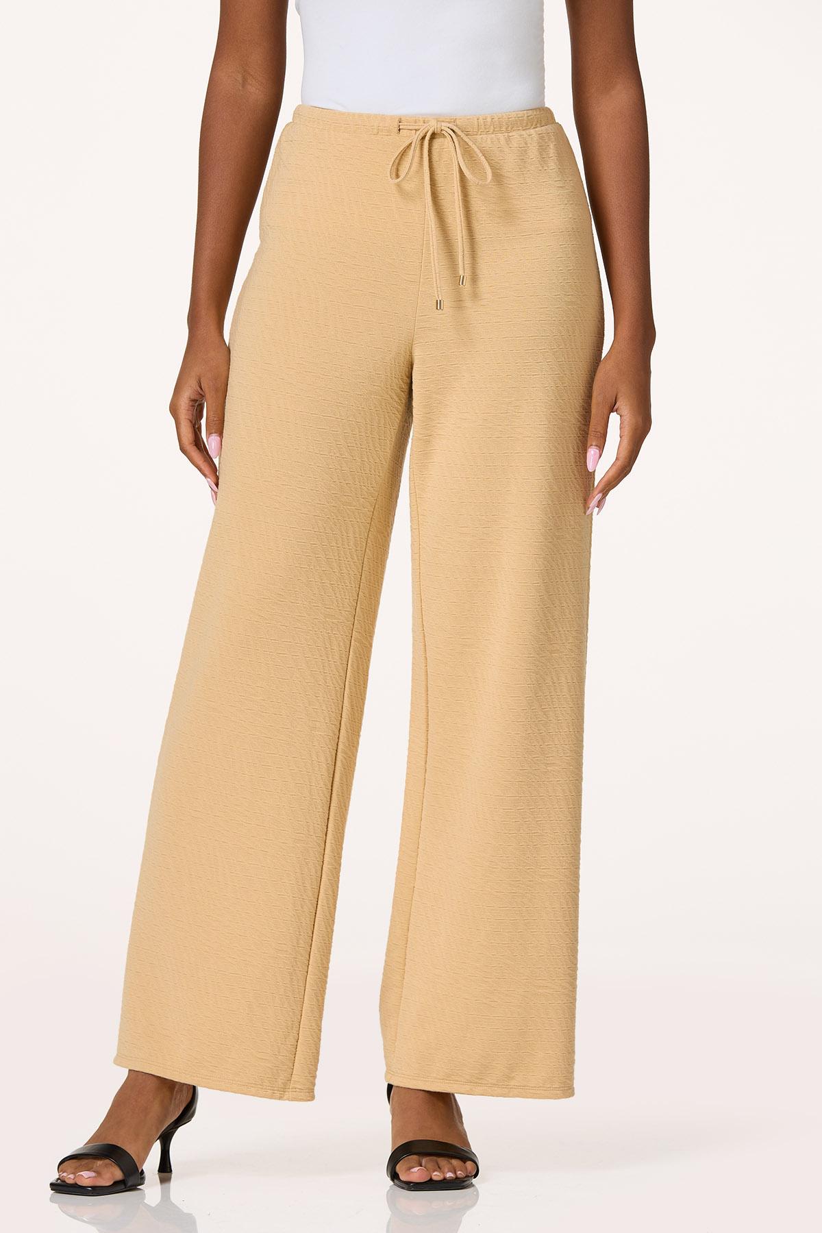 Make a memorable impression when you show up wearing this breezy, wide leg style, featuring a stretchy-drawstring waist, neutral hue and crinkled knit, making it the perfect match to our textured cold shoulder top.