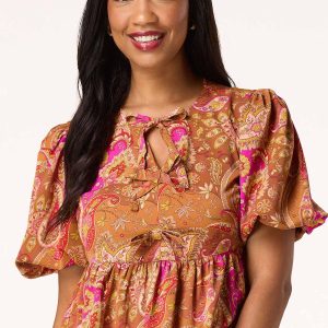 This style is oh-so stunning and perfect for helping you stand out in the best way. Lightweight-smooth fabric features an eye-catching multicolor floral-paisley print, a multi-tie front closure, puffy bubble short sleeves and a peplum hem for a flirty and fun style.
