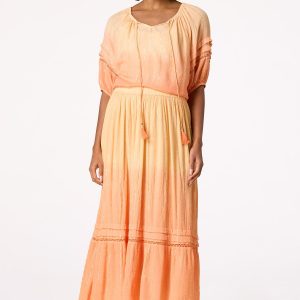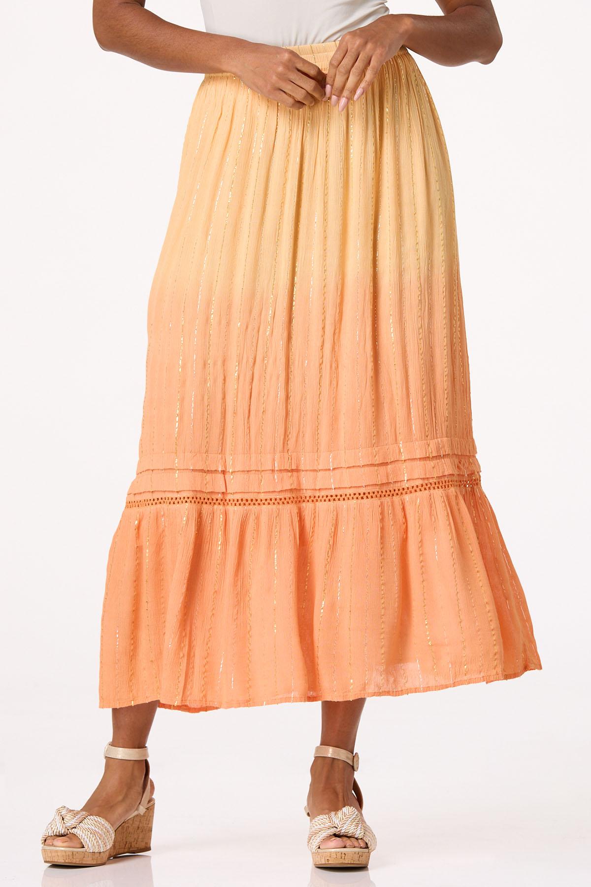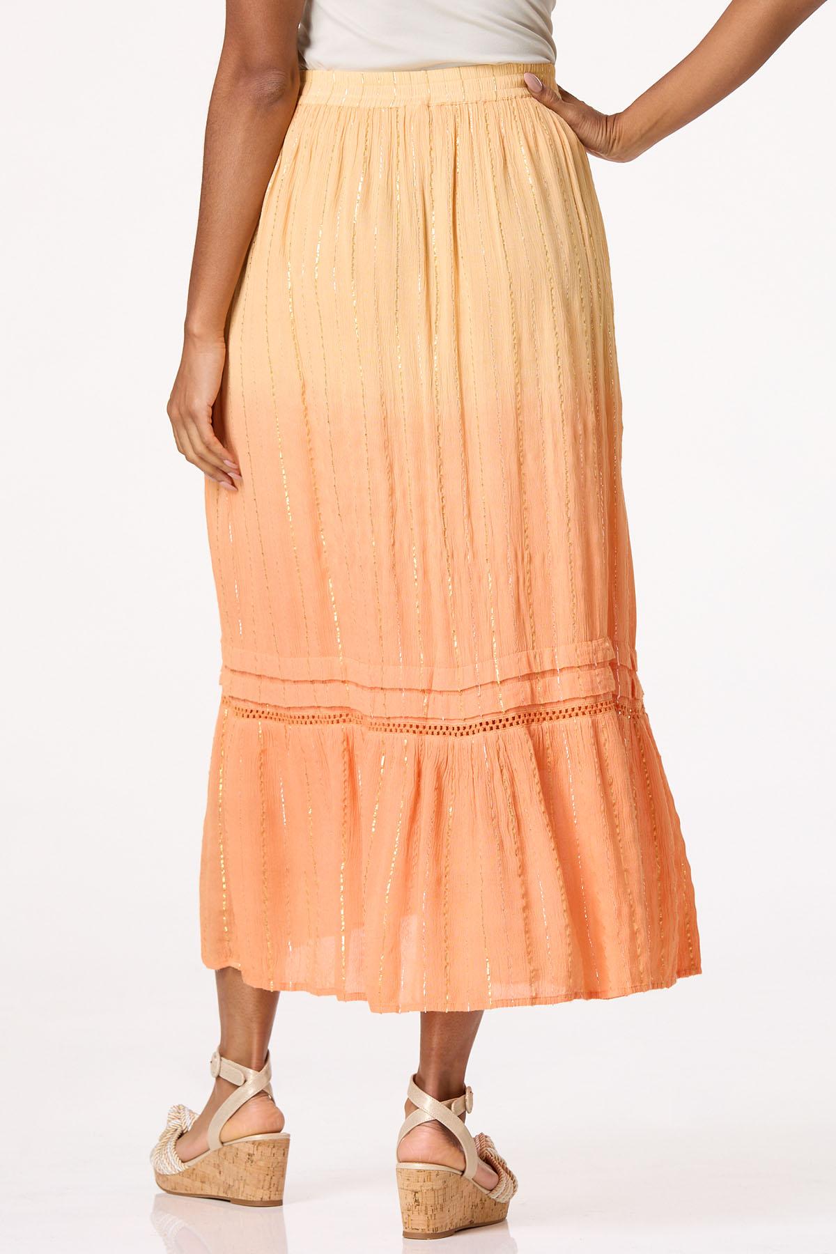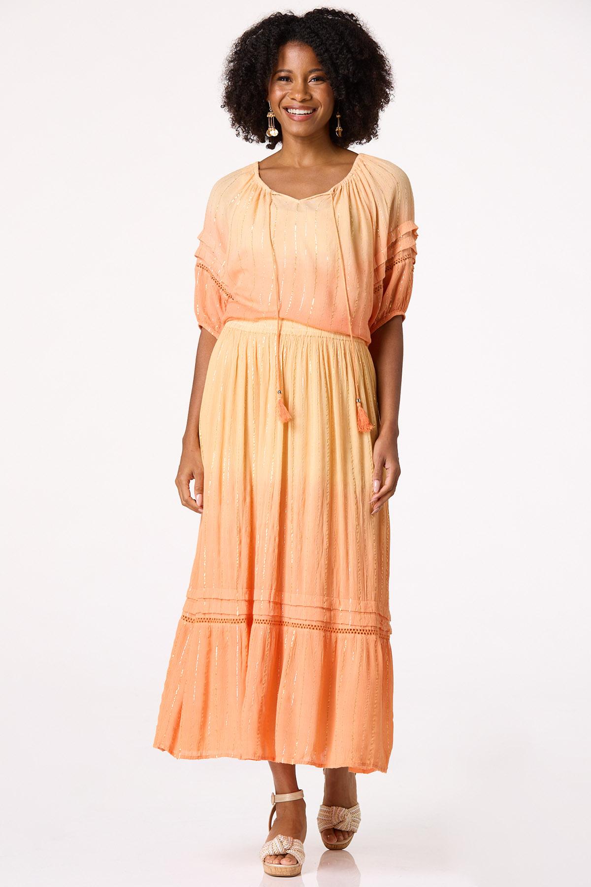 Take your moment in the sun with the beautiful-boho vibe and ombre orange hue of this tiered skirt. An elastic waist, crepe texture, ladder-stitch detail and gold-shimmery stripe are the details that will even leave the sunshine smitten. Our matching poet top with a tasseled neckline is all you need for that happily-ever-after finish you’ve been dreaming of.