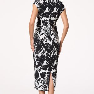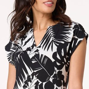 You’ll be walking on sunshine when you choose to show off this chic style, featuring a notched, v-neckline, sleek-stretchy fabric, relaxed fit and tropical-palm print in a black and white color palette.