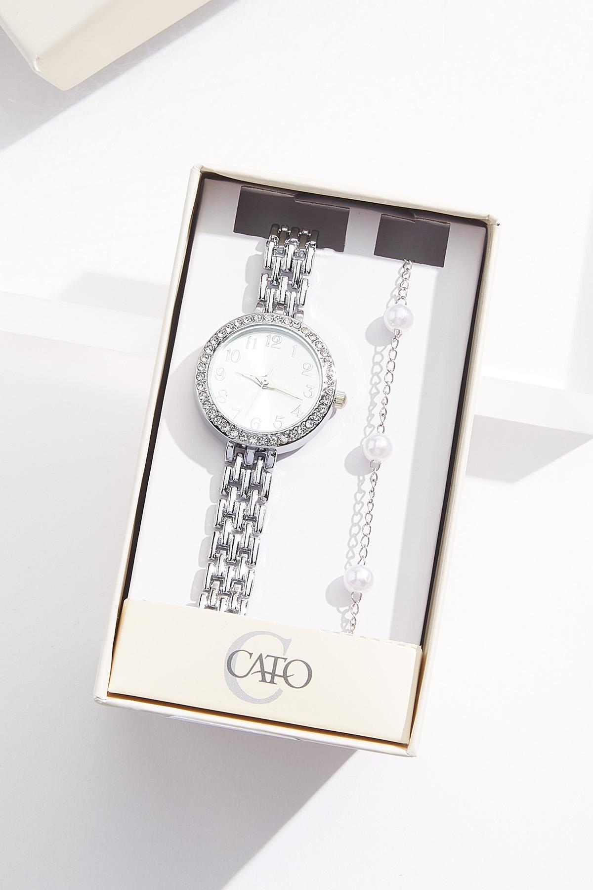 A silver rhinestone watch, perfectly set in a charming box with a floating pearl chain bracelet – ready to gift, ready to shine.