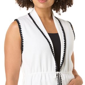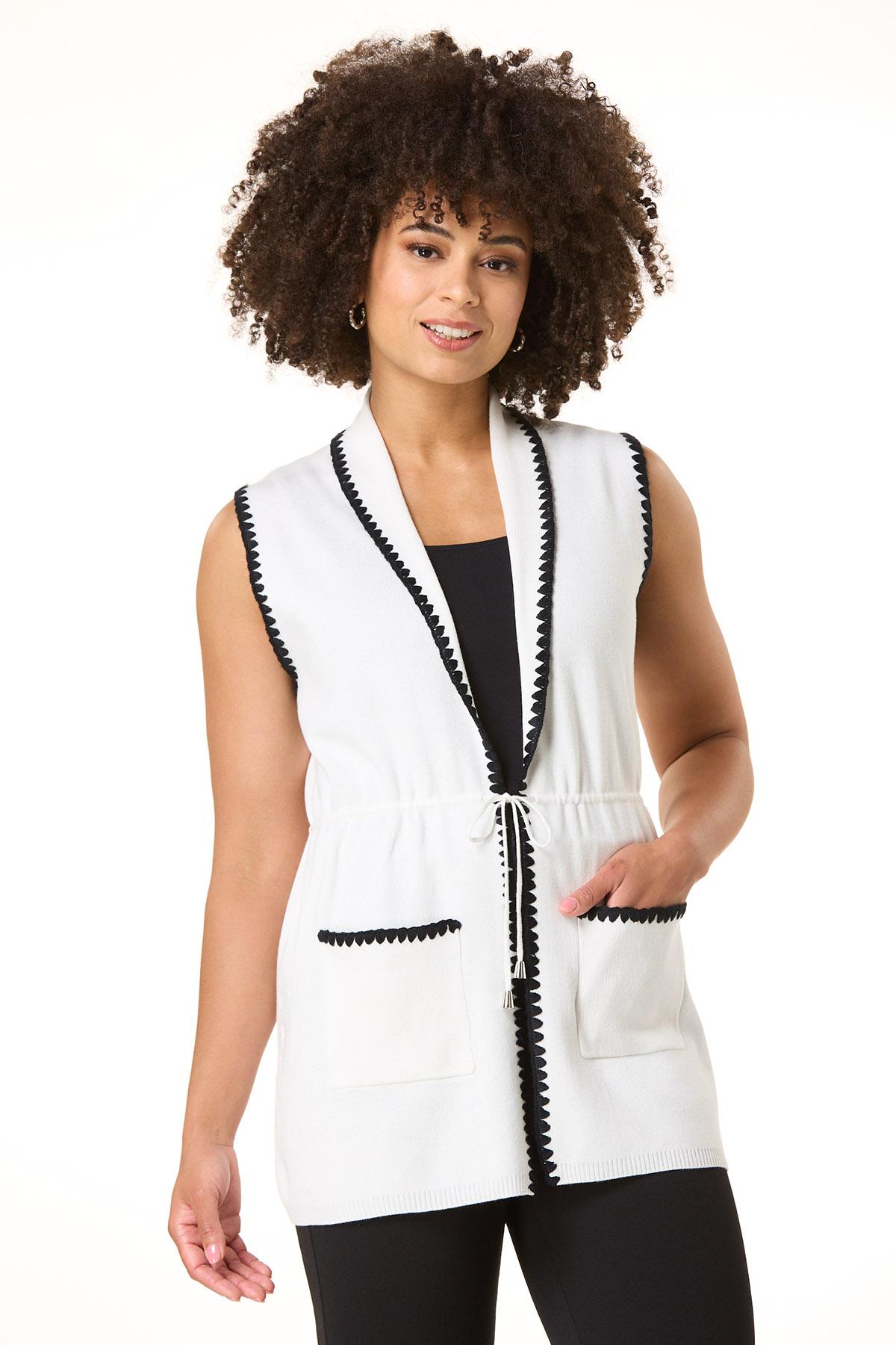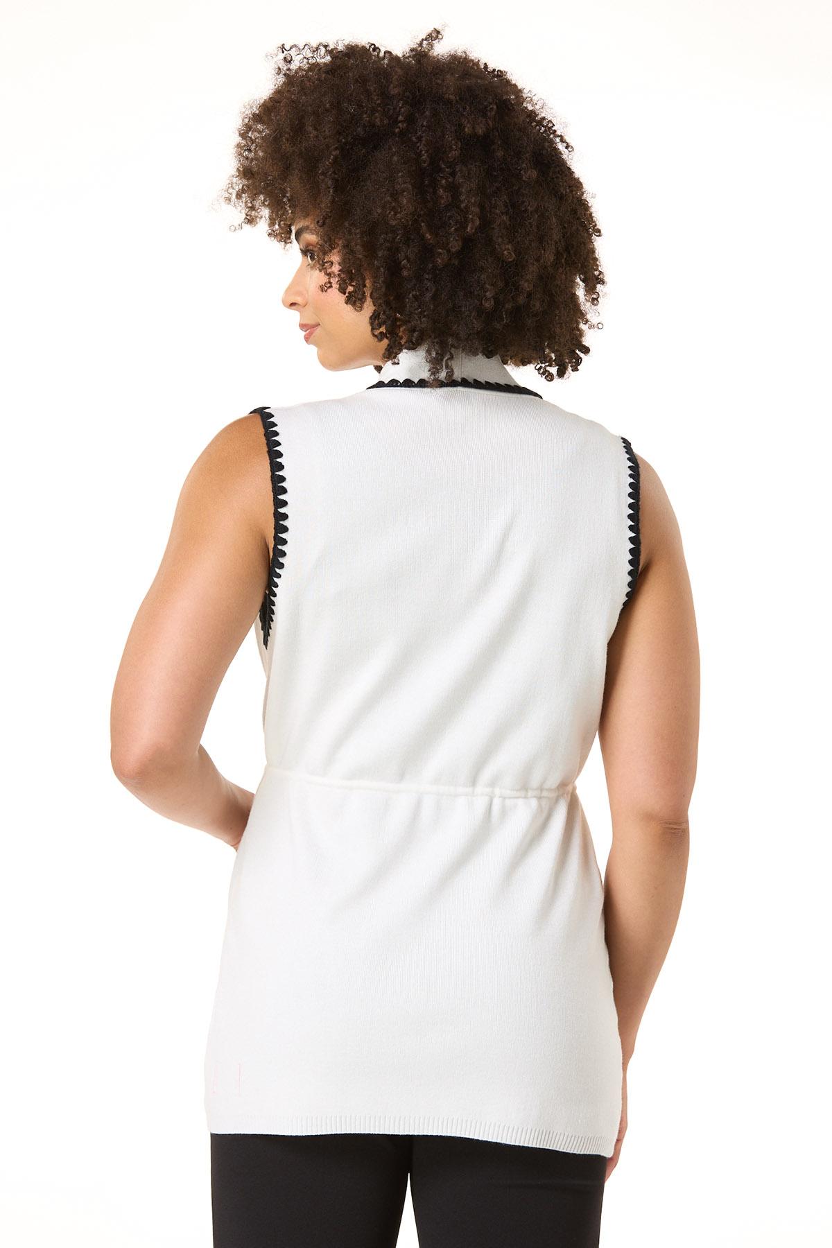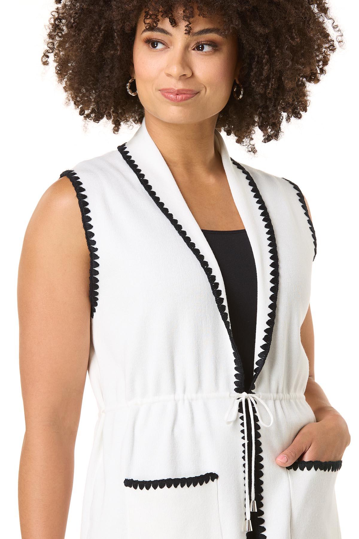 Count on looking pretty, polished and ready to take on a day in the office or at a dinner with friends with this layering piece. This sleeveless style will take a simple tee or tank and give it a little makeover with contrasting shades, whip stitch detail and a drawstring waist for a flattering fit that’s ready to top off your favorite jeans or black bottoms.