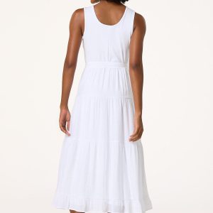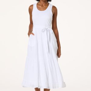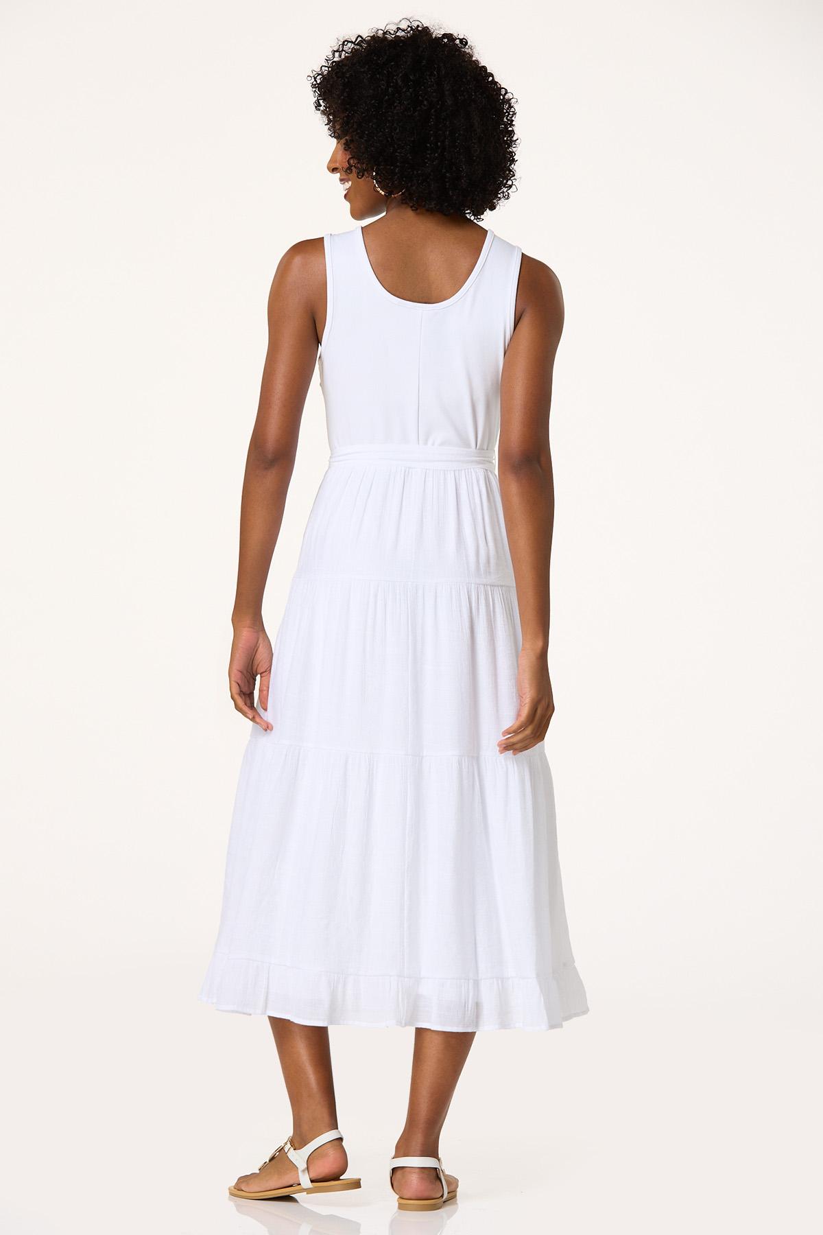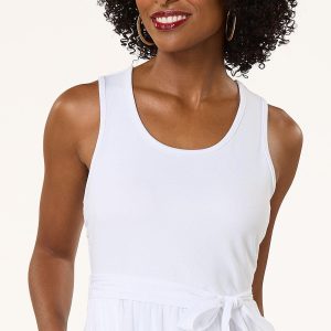 Keep it cool and chic in this white tank twofer midi dress. With its clean lines and flattering fit, plus a removable belt to cinch your waist, it’s the perfect blend of effortless elegance and versatility.